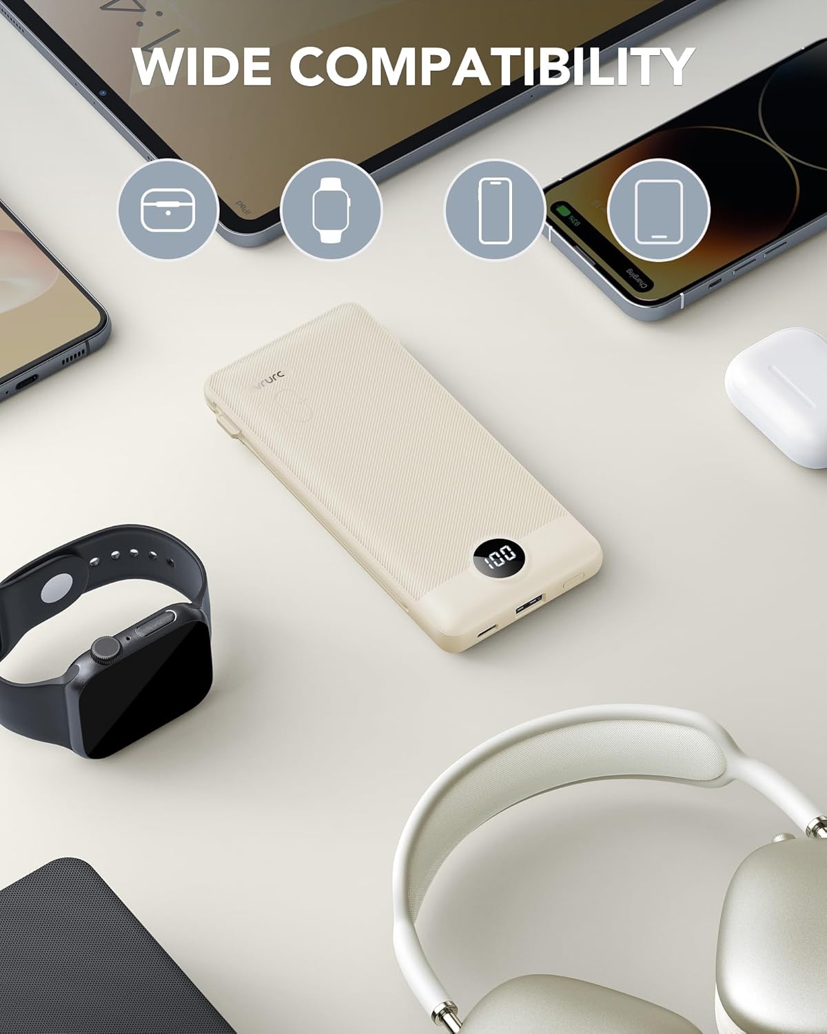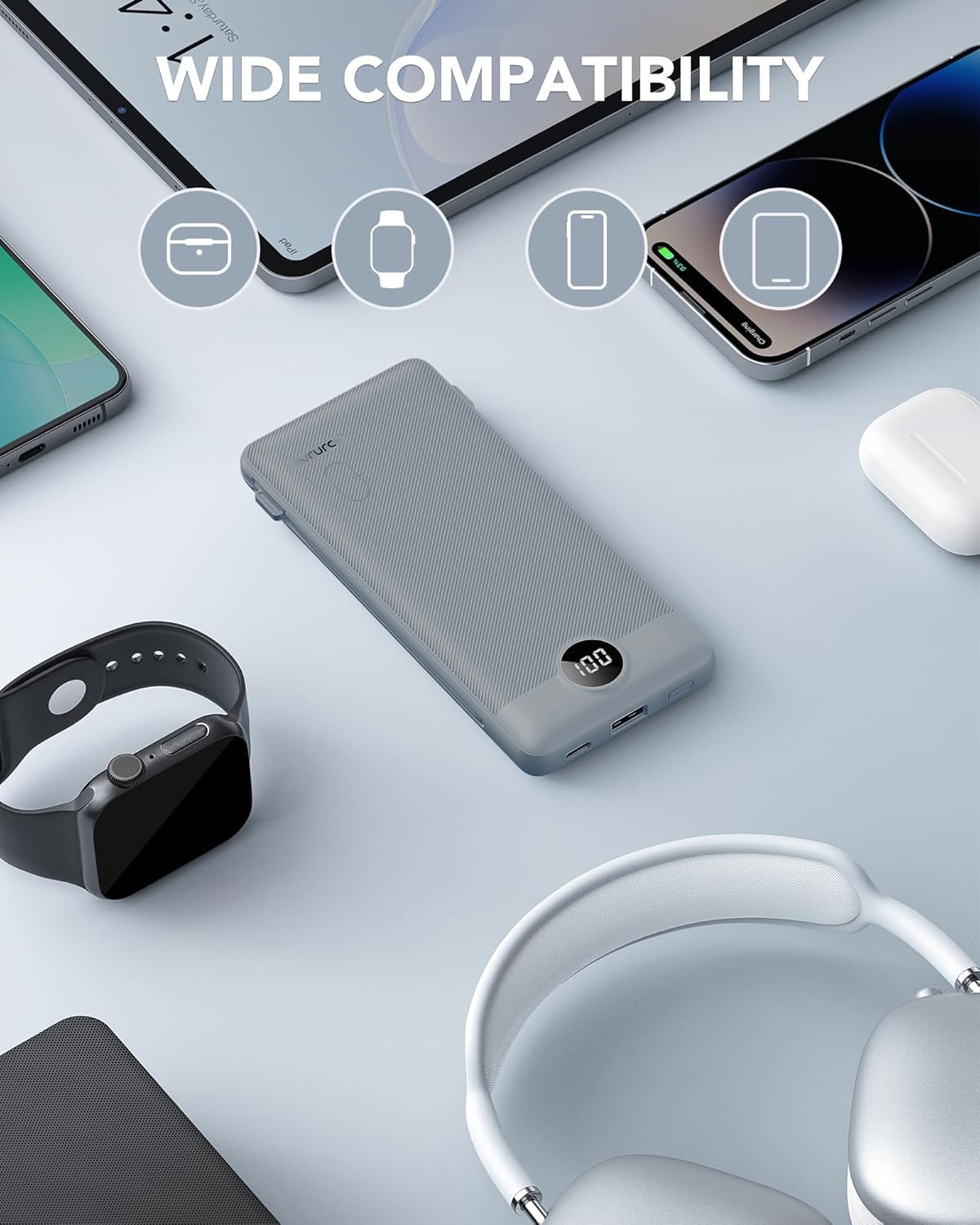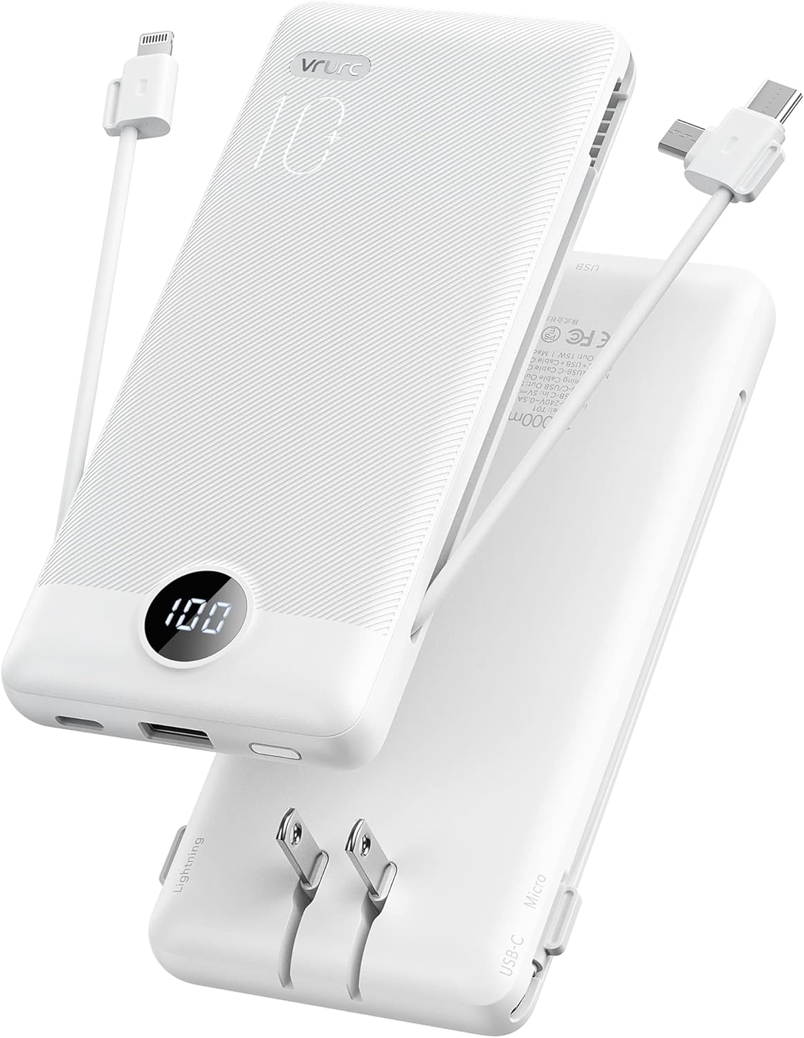 Portable Charger for iPhone, 10000mAh Power Bank with Built-in Cables & AC Wall Plug, USB C Phone Charger 5 Output External Battery Pack Compatible with iPhone Samsung Google Pixel Android -White