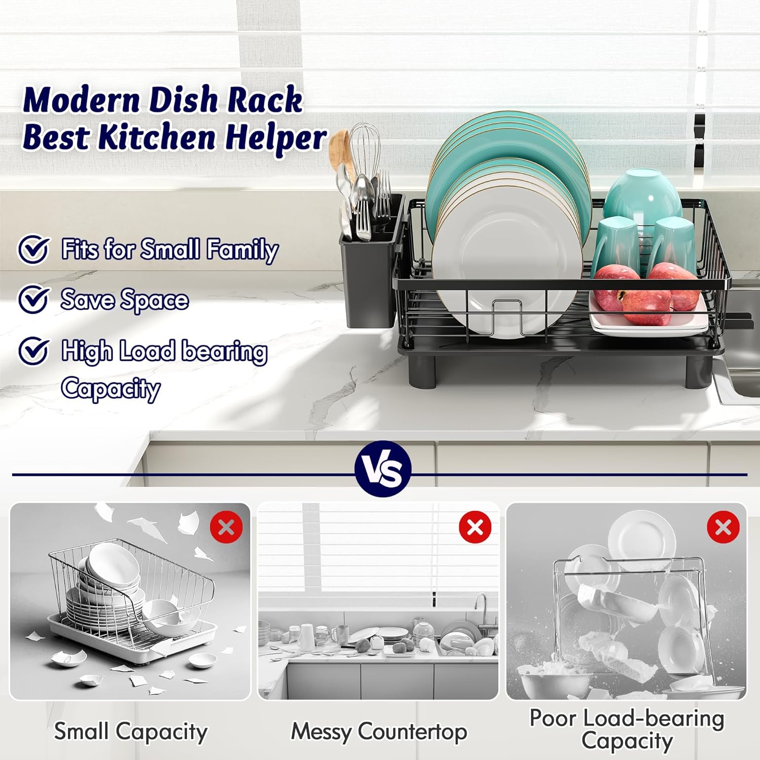 Qienrrae Dish Drying Rack with Drain Board for Kitchen Counter, Stainless Steel Large Dish Drainer with Detachable Utensil Holder, Durable Dish Rack Used in Sink and Sit on Countertop, Black