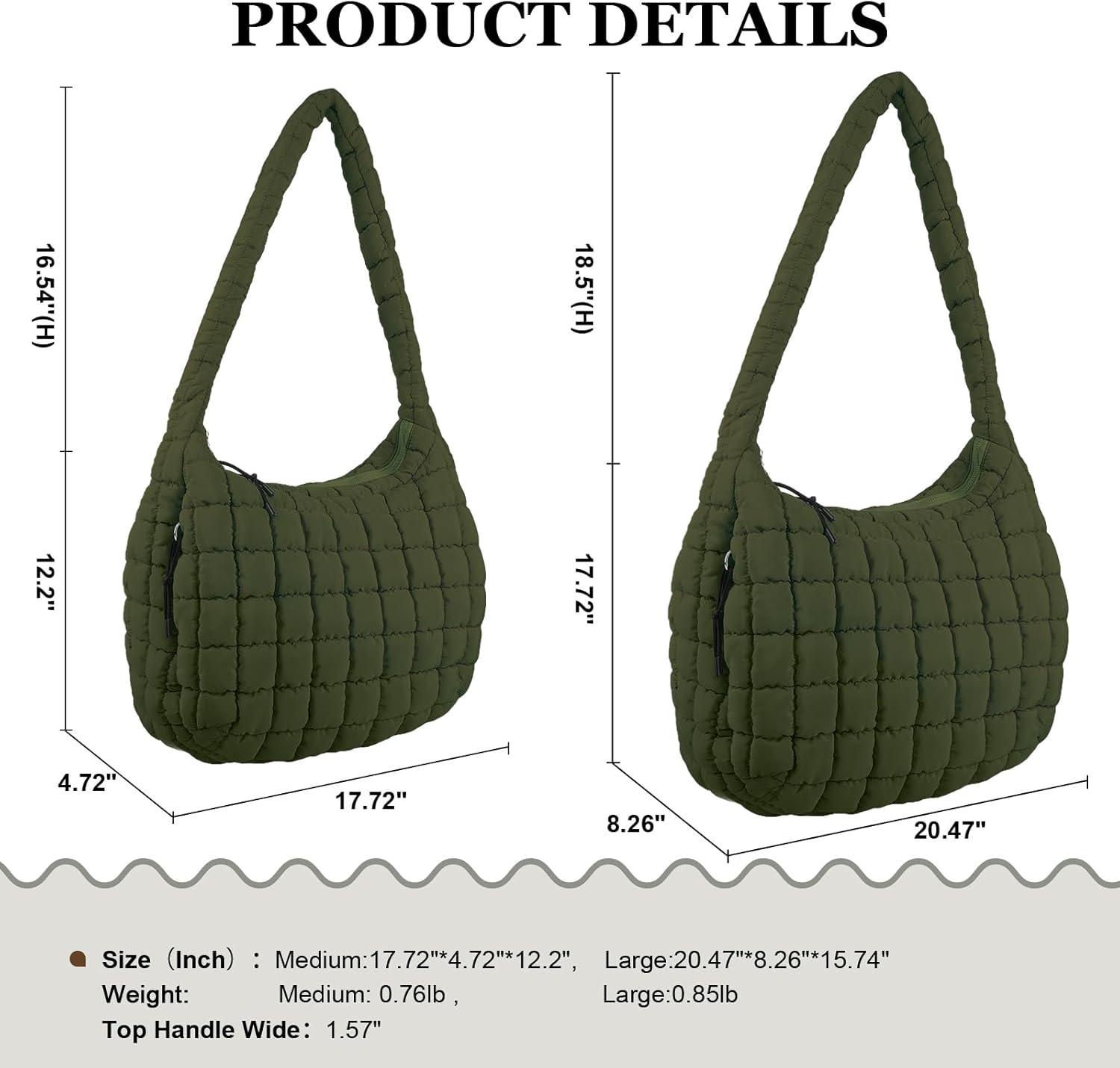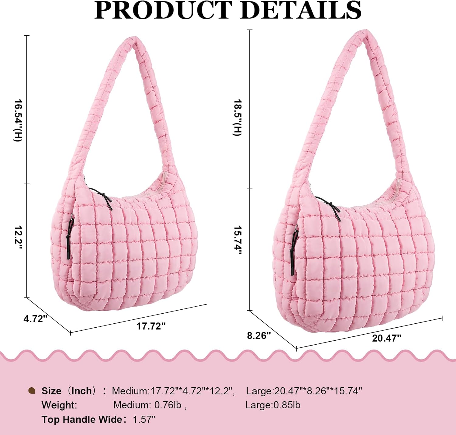 - 【Quilted Puffer Tote Bag】Quilted Puffer Tote Bag with two size, Medium size:17.72" (L)× 12.2" (H)× 4.72" (W), Weight: 0.76lb, Shoulder strap height: 16.54". Large size:20.47" (L)× 15.74" (H)× 8.26" (W), Weight: 0.85lb, Shoulder strap height: 18.5". Easy to store all your daily use.