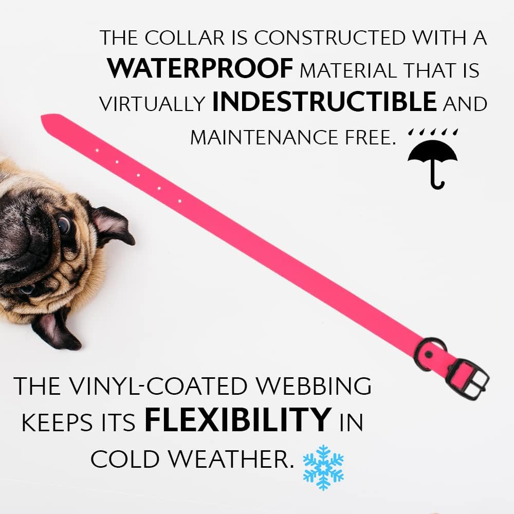 - COMPLETELY WATERPROOF: Does your pup love the beach? This is the perfect collar for you! Vinyl-coated webbing is more durable than rubber, nylon, silicone, thin or plastic dog collars and will never absorb moisture, dirt. These waterproof collars for dogs are resistant, which is great for water dogs or hunting dogs. The collar repells dirt or and doesn't catch any fur so it stays dry and clean! Perfect as a hunting dog collar or training collar for your Furry Friend!