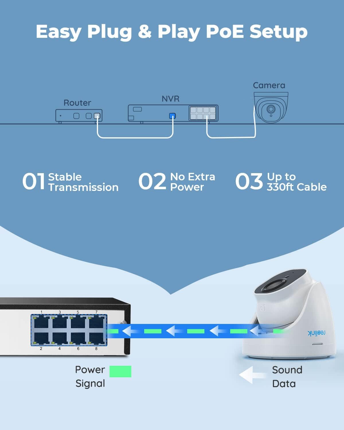 • Plug and Play PoE System – A simple PoE connection makes it easier to set-up and install your home security camera system. With a single network cable, stretching up to 330ft, users can enjoy smooth security coverage of their entire house. This is perfect for both beginners and DIY camera enthusiasts.