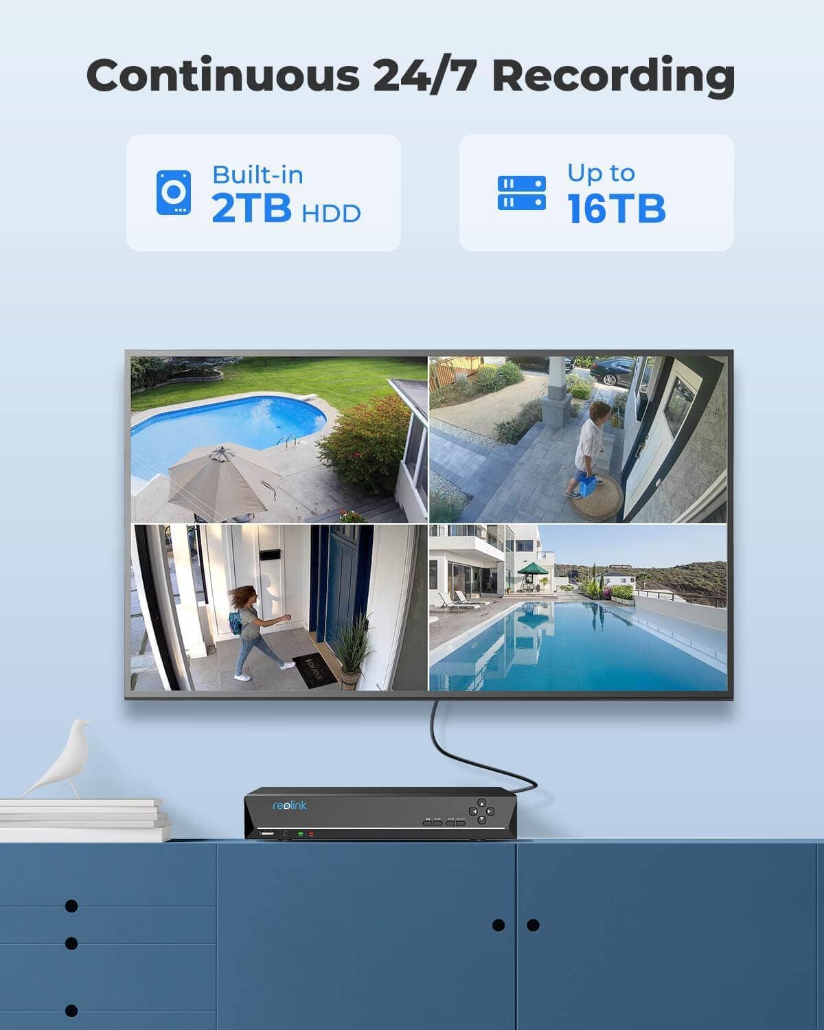 • Continuous 24/7 Recording – With a pre-installed 2TB HDD, users are provided reliable 24/7 recording. You can also install an external hard drive (up to 8TB) for backup storage.