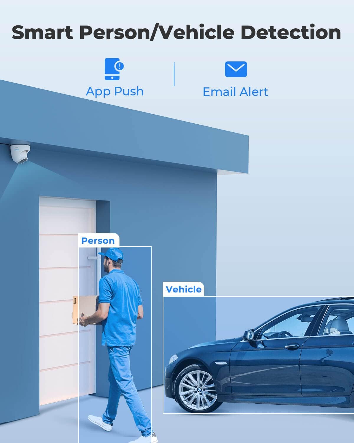 • Person/Vehicle Detection – Smart PoE IP cameras can identify people and vehicles in terms of their shapes, minimizing unwanted alerts such as animals or shadows. Cameras can also be configured to specify the type of detection when sending alerts to you. Know what happened simply by glancing at the lock screen.