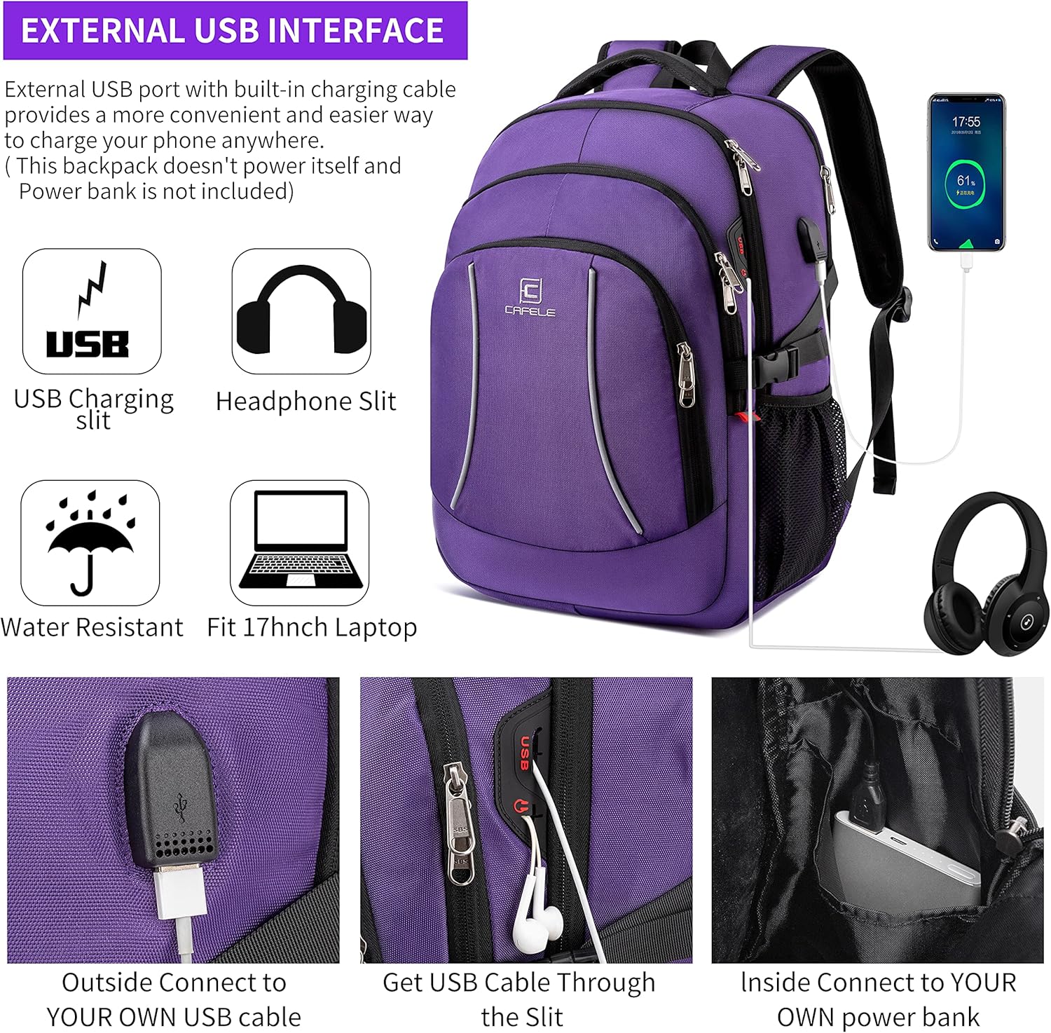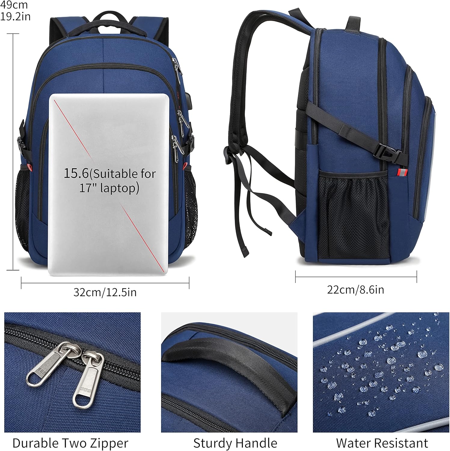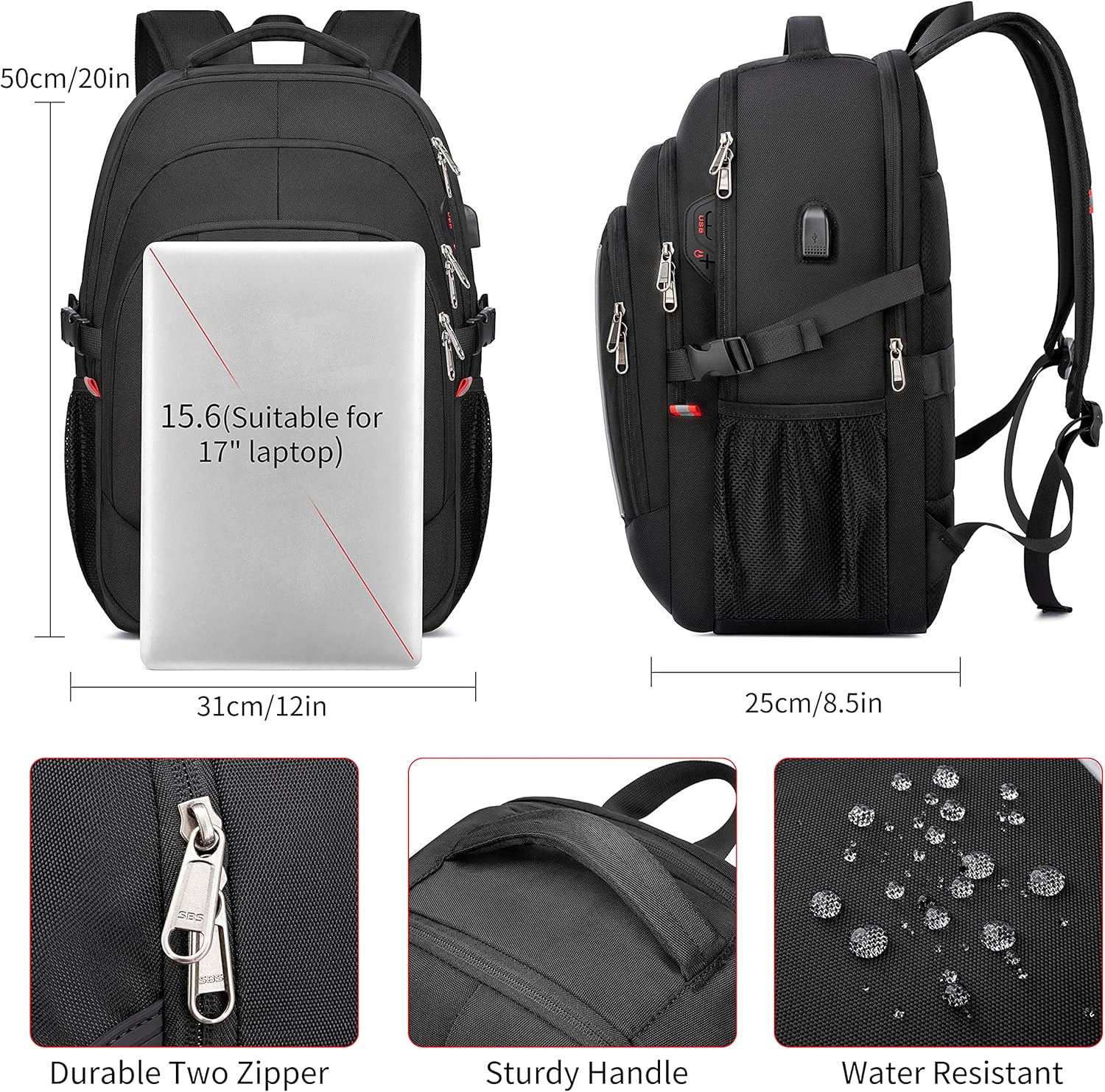 Large Capacity: Soft lined laptop rucksack accommodates laptops less than 17 inch with enough enormous space. Good companion during your whole journey; Big enough so you can bring everything you need. Luggage Straps: A humane design with a drawbar sleeve on the rear, try to slide your backpack onto the luggage's puller to make your journey easy when you feel tired to carry backpack on your shoulders.Thicken shoulder straps combined with padded back cushion brings you a great comfort. Water-resistant: This backpack is waterproof splashing in daily using, but please do not use it for the rainy day and heavy rain. Comfortable Straps: Thicken shoulder straps combined with padded back cushion brings you a great comfort. Safety Design: The anti-stuck design zipper has its own keyhole. An RFID pocket with RFID function helps protect personal data encoded on your credit card, ID card and passport.You can lock the bag pack with anti-theft lock to protects your wallet and other valuables inside from thief. USB Port & Earphone Hole Design: Featuring earphone hole gives convenient access to earphone usage, built-in USB charging port offers a convenient charging of your electronic device anywhere. Perfect for business trips or weekend getaways or for simply heading to the office or school and home again. The external hook can easily hold your key-chain, water bottle,hat, glasses and other accessories. Application: Perfect for business trips travel hiking gaming or weekend getaways or for simply daily heading to the office or school and home again.