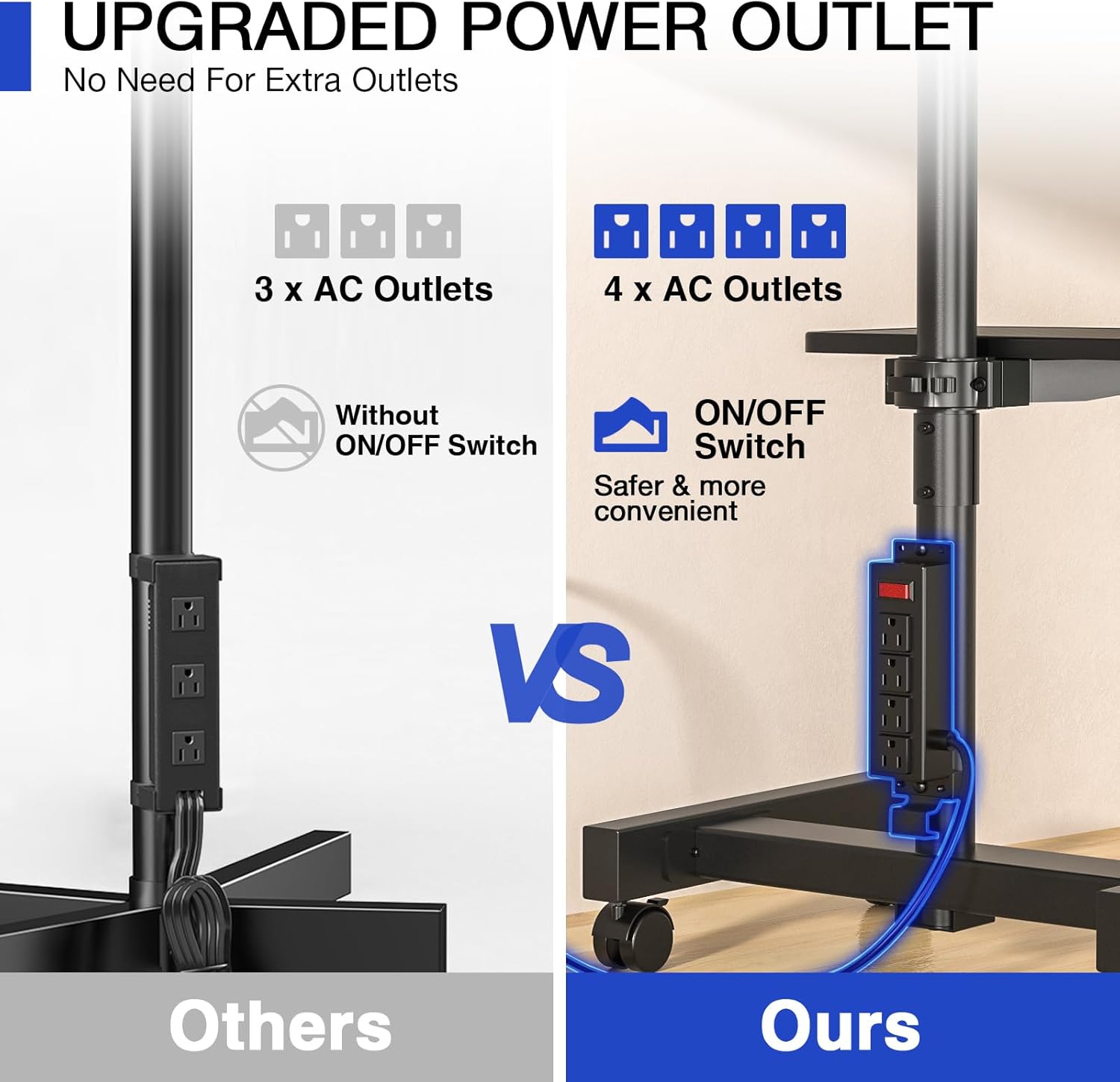 • POWER OUTLET & CABLE MANAGEMENT: Rfiver portable TV stand is equipped with a power strip (ETL certified) to say goodbye to messy wires, the power strip has a thicker 6.5 ft extension cord made of 16AWG pure copper and a one-button switch that turns it off when not in use, which can effectively prevent children from touching it and other problems, ensuring the safety of you and your family. Plus cable management to keep cables organised and tidy