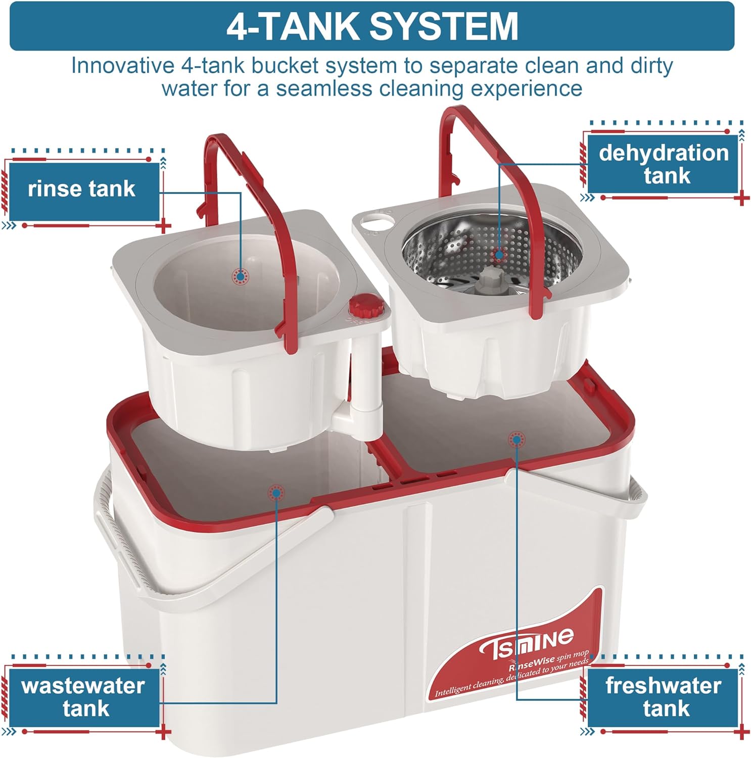RinseWise Spin Mop and Bucket Separate Clean and DirtyWater, Mop and Bucket with Wringer Set, 4-Chamber Commercial Spinning Mopping Bucket Cleaning Supplies with 8 Microfiber Replacement Head Refills