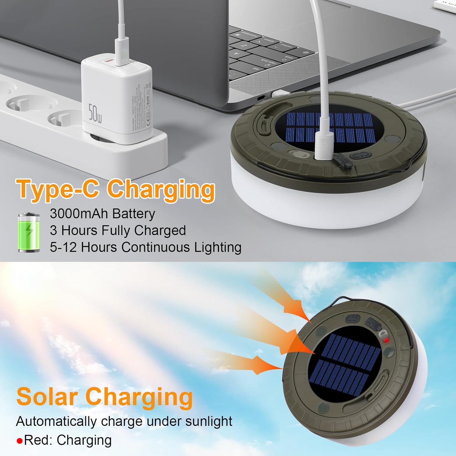 • 【Solar & USB-Rechargeable Camping Lamp】 Equipped with a high-performance 3000mAh battery, this outdoor string lights supports dual charging methods: efficient solar power or USB-C cable (included). Once fully charged, it provides 5-12 hours of runtime, depending on the selected mode.
