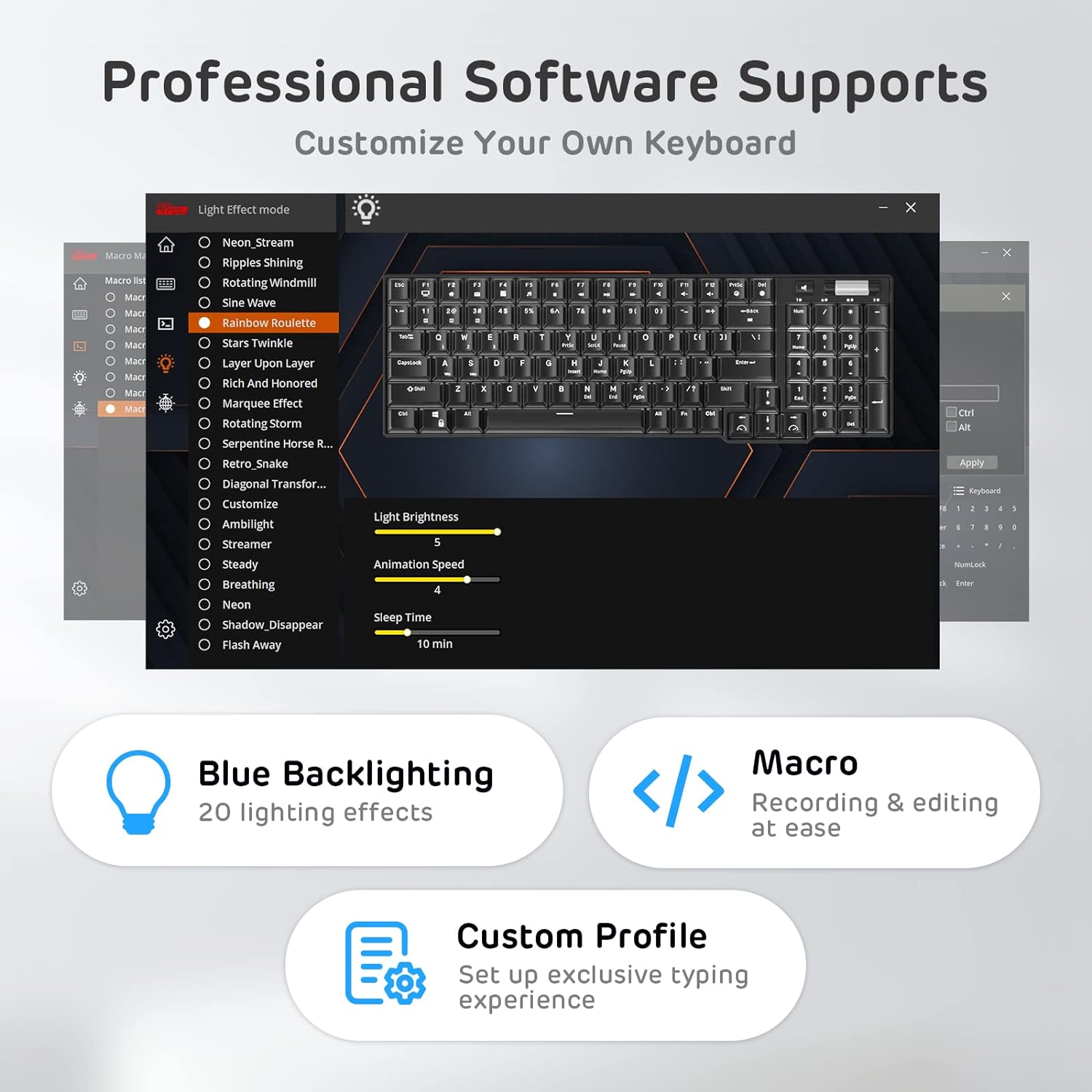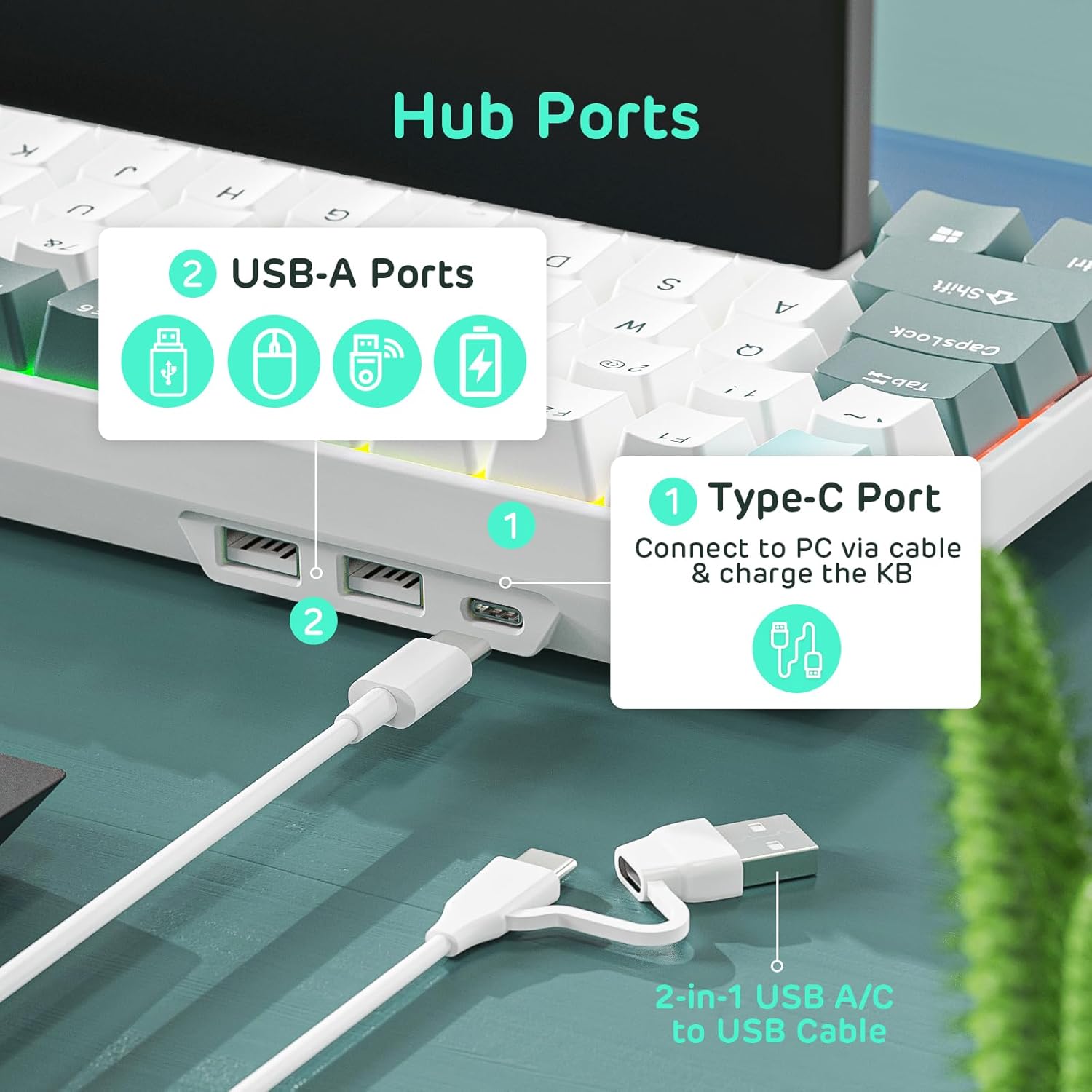 Hub Design - This wireless mechanical keyboard is armed with 2 built-in USB pass-through ports and 1 Type-C Port, allowing to back up more facilities, like a mouse or a headphone.