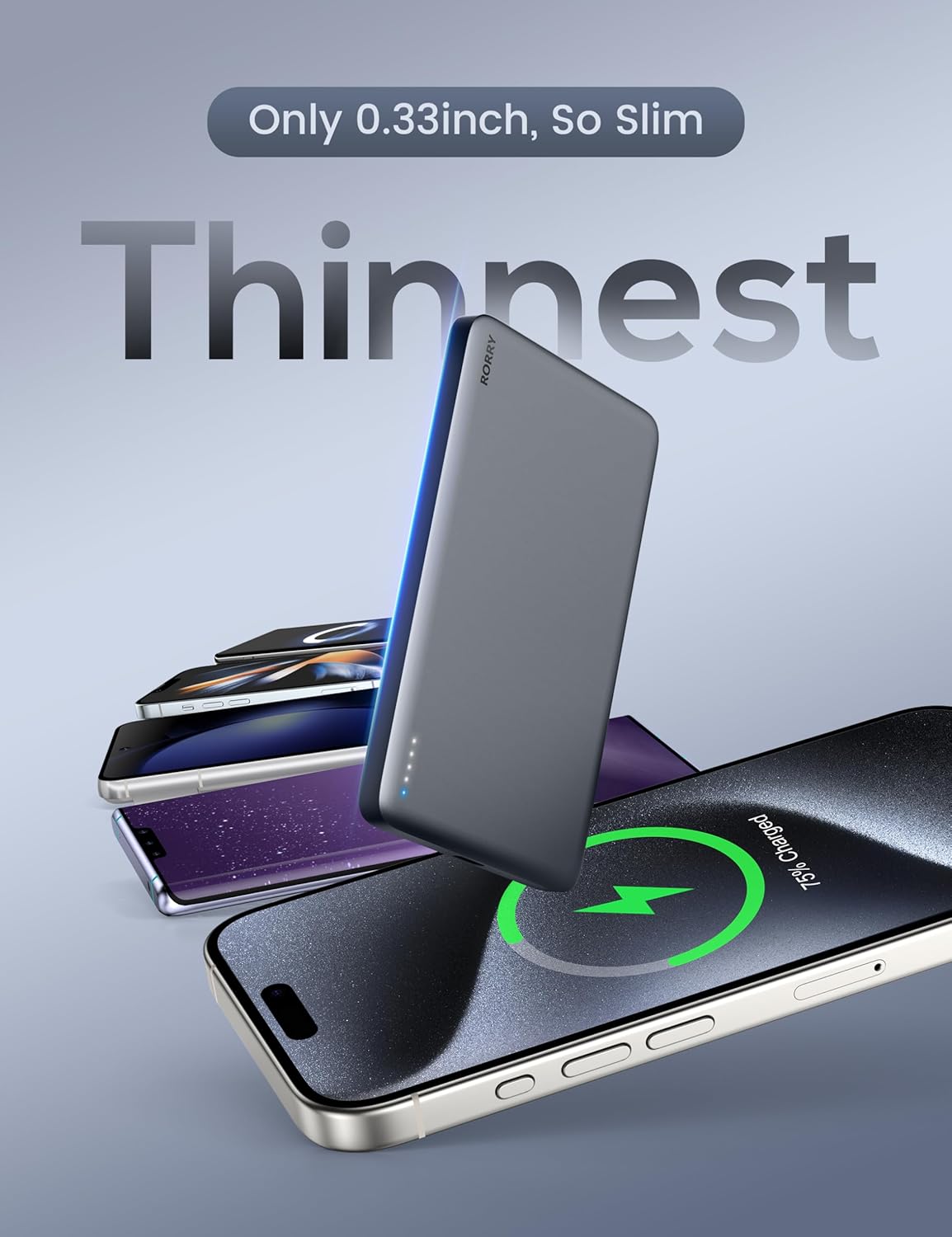 - [Snap It & Forget It!] World's Thinnest 0.3". Say goodbye to bulky chargers! At just 0.3 inches thick (7.6mm), our for Magsafe power bank redefines portability. It slides effortlessly into your pockets or tight jeans.Thinner than a credit card, yet packs 5000mAh to keep your phone charged all day.