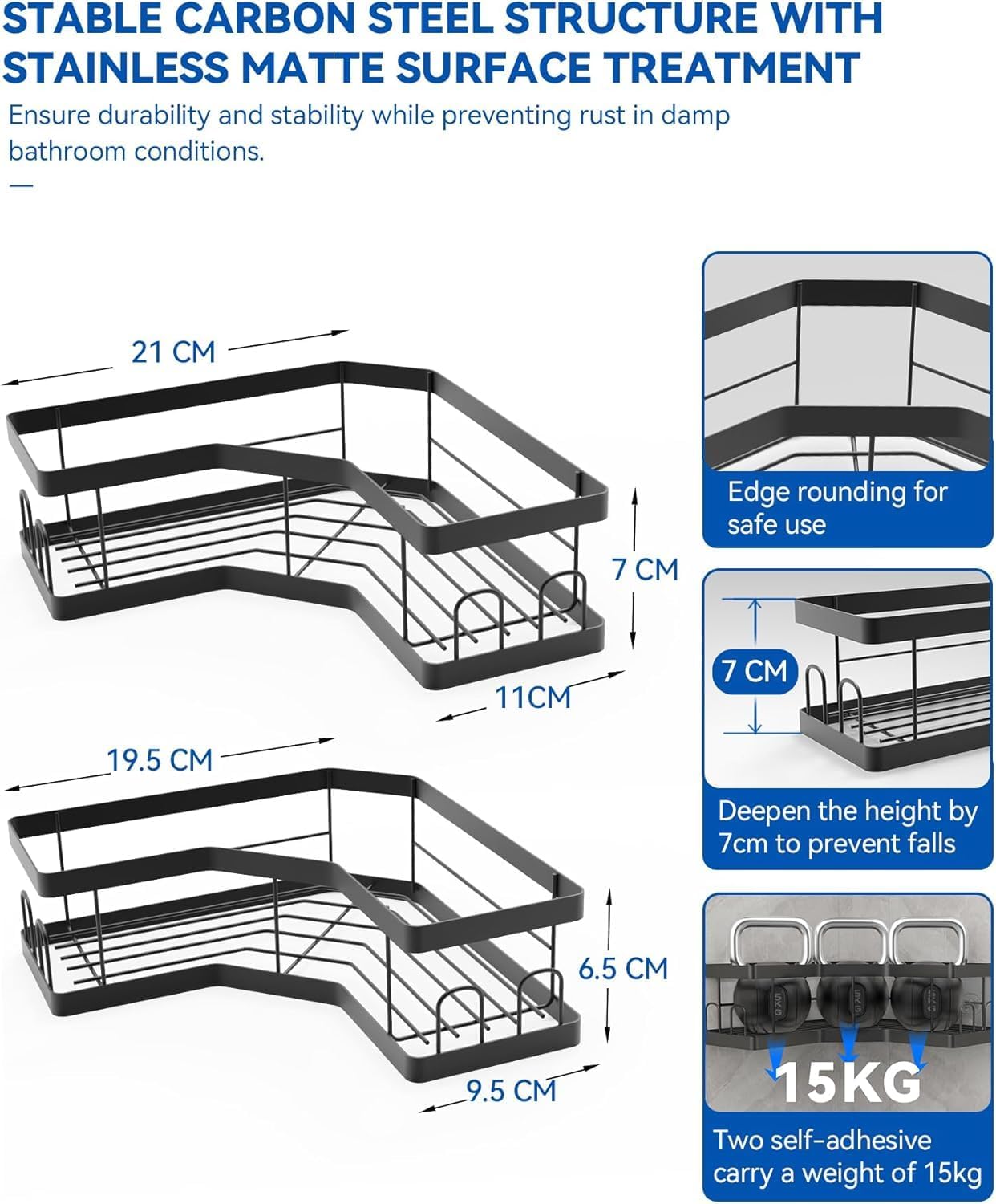 Shower Caddy, 2 Pack Bathroom Shelves, Adhesive Shower Shelf No Drilling, Black Shower Storage, Shower Organiser, Rust-Resistant Shower Caddy Corner, Shower Soap Holder, Bathroom Accessory