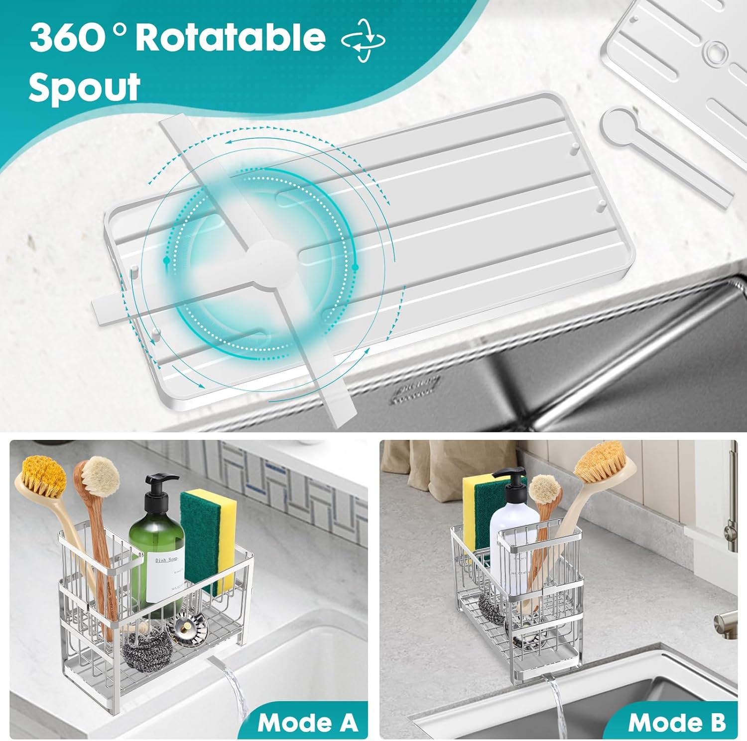 • 【360° ROTATABLE SPOUT】This kitchen sink caddy comes with a rotatable spout, the spout can be rotated 360°. The removable drip tray with a concave center to ensure that the water in the sponge can be directed to the sink. There won't be any water left on the countertop, you don't need to pull out the drip tray to clean it often, saving your cleaning time.