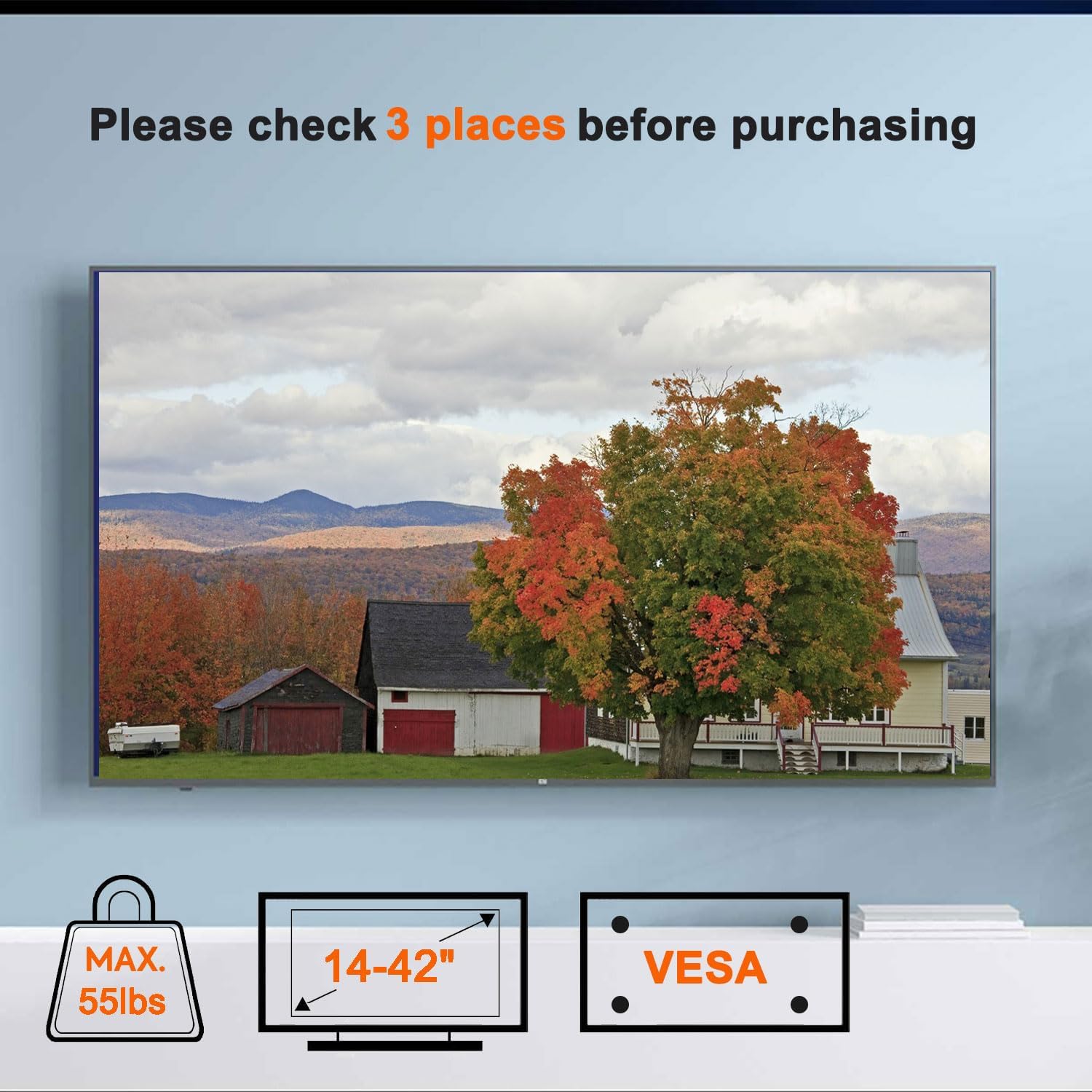 • 1. UNIVERSAL DESIGN: Our tilt TV Wall Bracket fit most 14-42" LCD TVs up to 55lbs(25kg), with VESA 75x75mm, 100x100mm, 100x200mm 200x100mm, 200x200mm mounting holes.