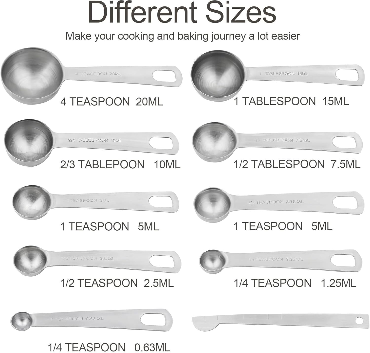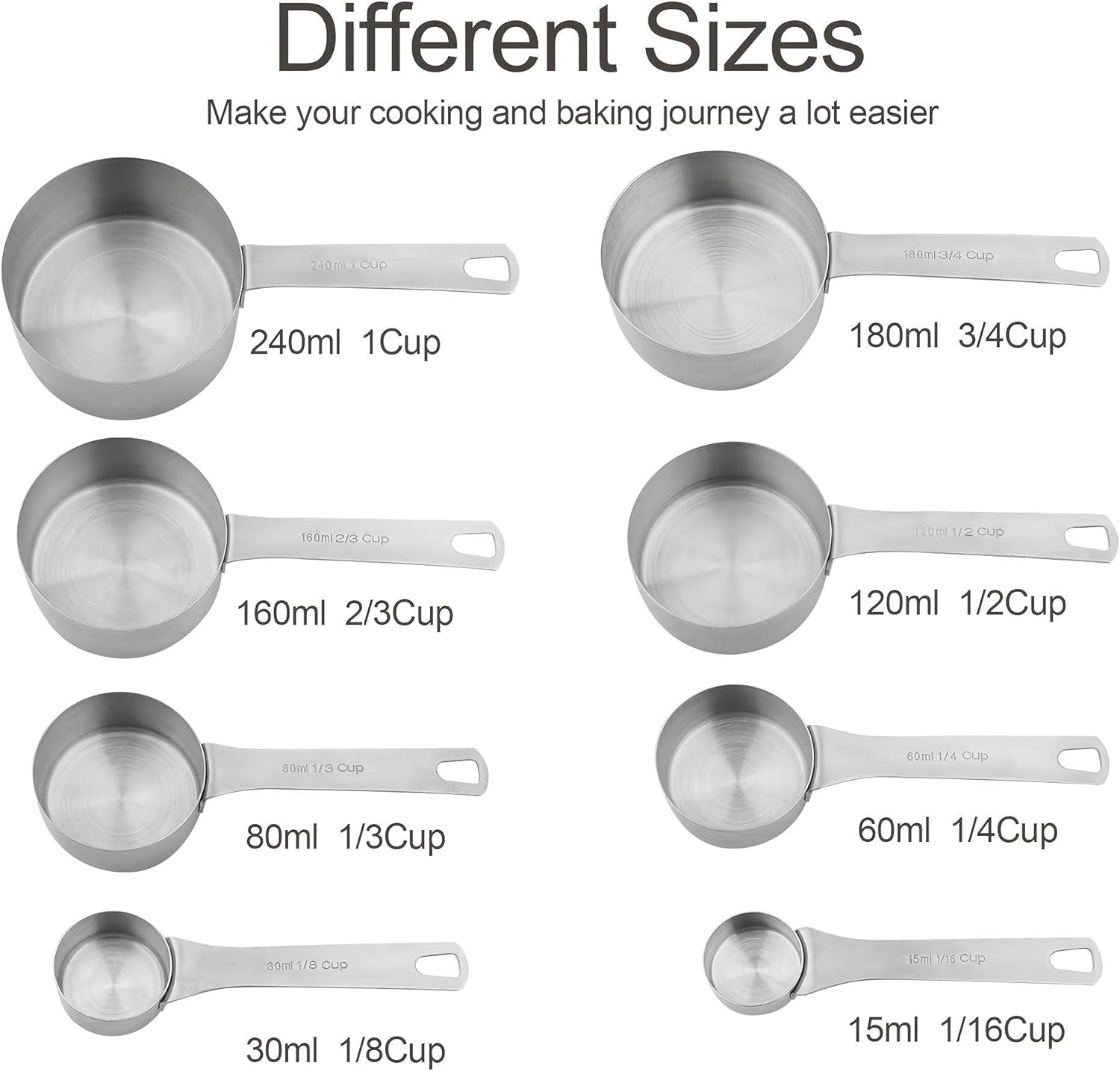 - Set of 18 different sizes - 8 Measuring Cups: 1 cup - 240ml<br>3/4 cup - 180ml,2/3cup - 160ml,1/2 cup - 120ml <br>1/3 cup - 80ml,1/4 cup - 60ml,1/8 cup - 30ml<br>1/16cup- 15ml,9 Measuring spoons sizes: <br>4 tsp - 20ml,1 tbsp - 15ml, 2/3tbsp- 10ml<br>1/2 tbsp - 7.5ml,1 tsp - 5ml, 3/4 tsp- 3.75ml <br>1/2 tsp - 2.5ml,1/4tsp - 1.25ml<br>1/8tsp - 0.63ml, 1 leveler & 2 rings
