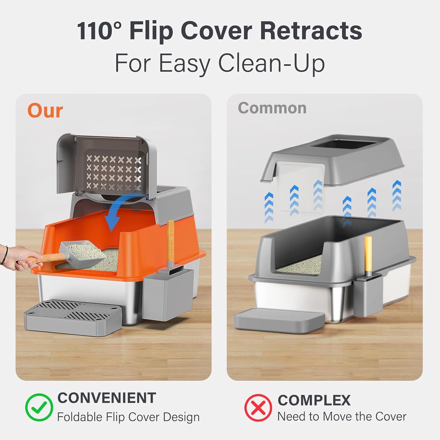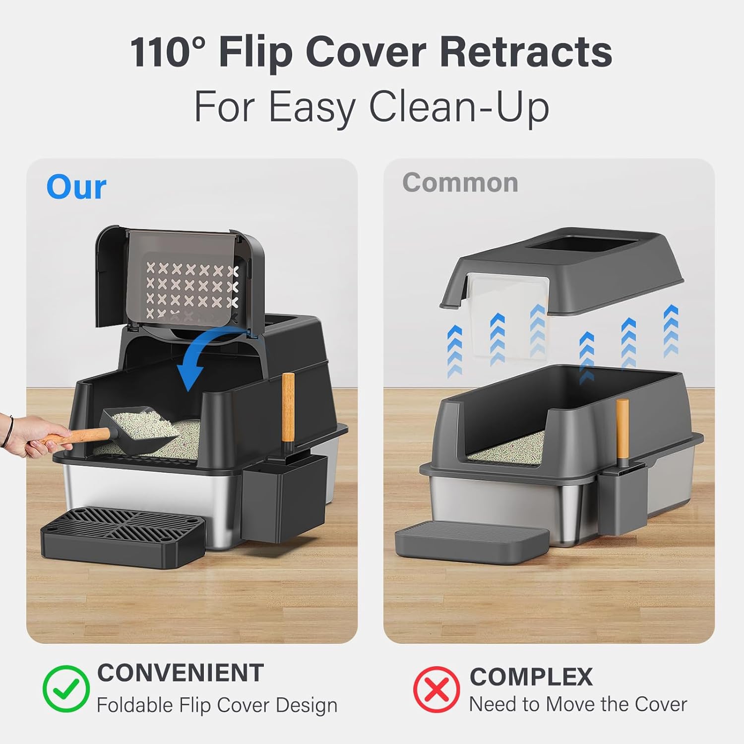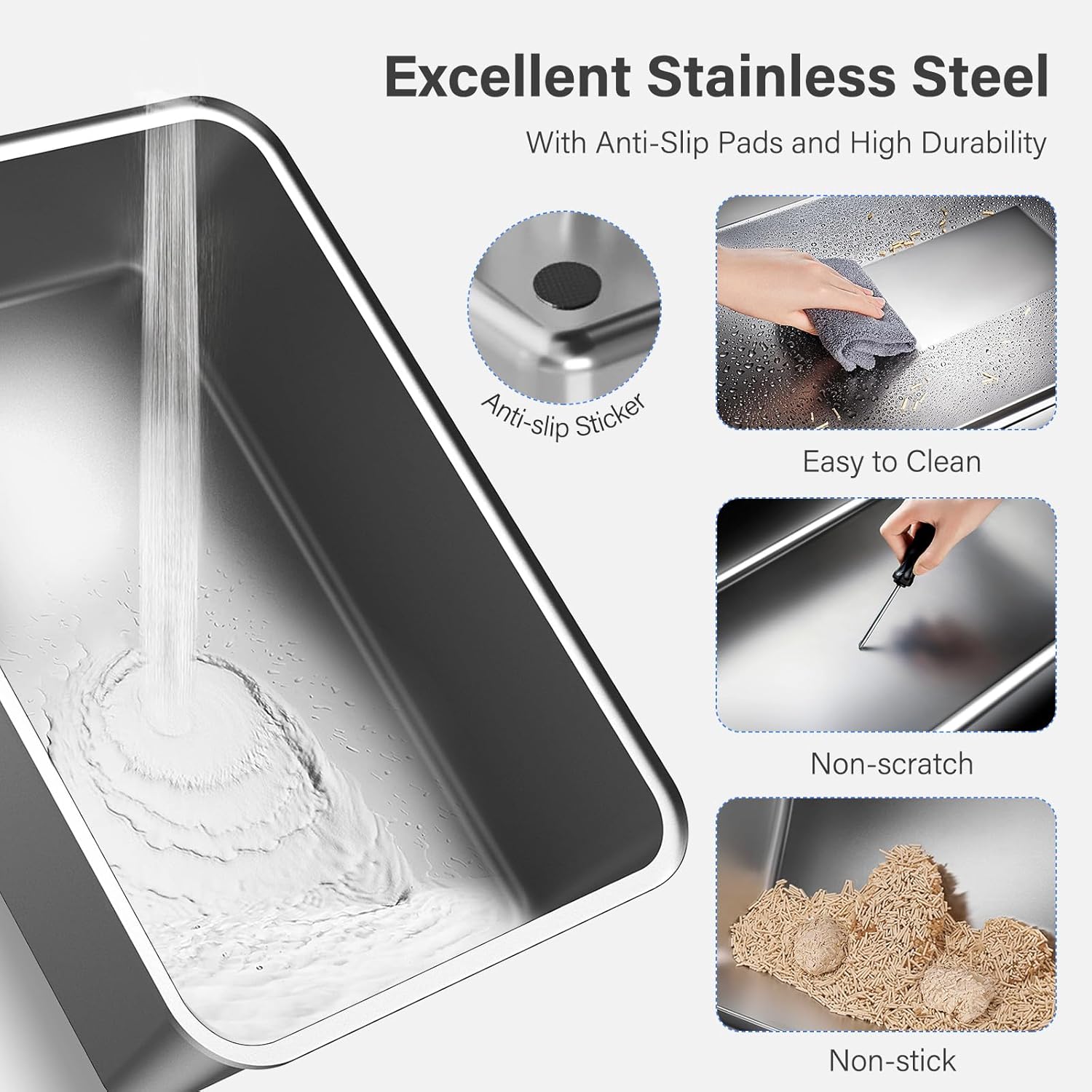 •  【Preferred 304 Stainless Steel】Unlike plastic litter boxes, the high quality and sturdy stainless steel litter box lid prevents odors, is more durable and easier to clean, and can even last up to 5+ years of service life. The stainless steel litter box with the included anti-slip sticker ensures that your cat won't shift or tip over when digging