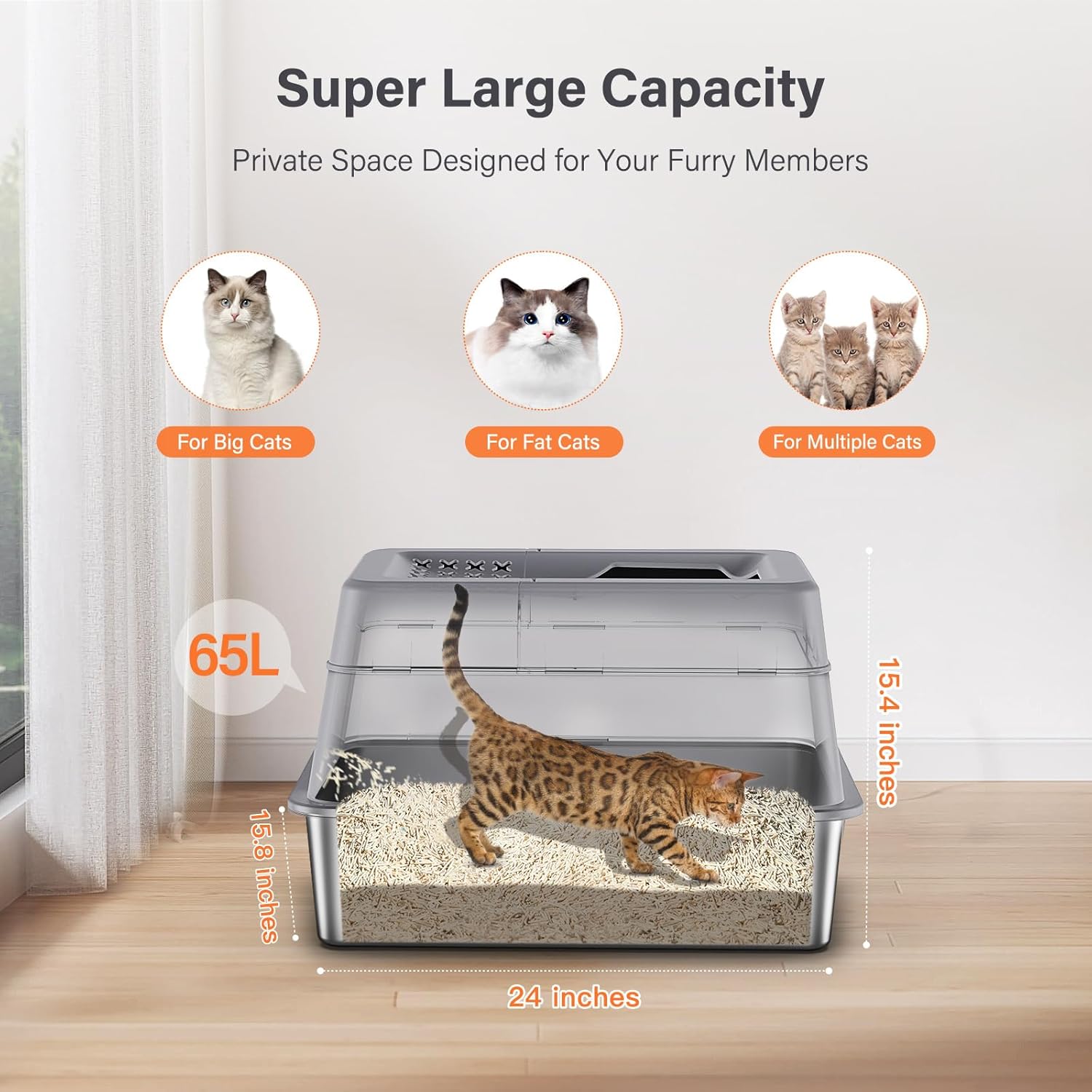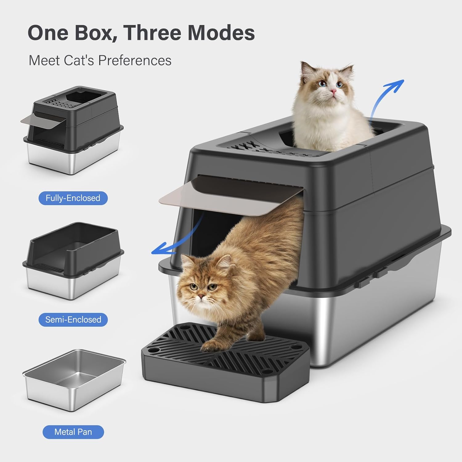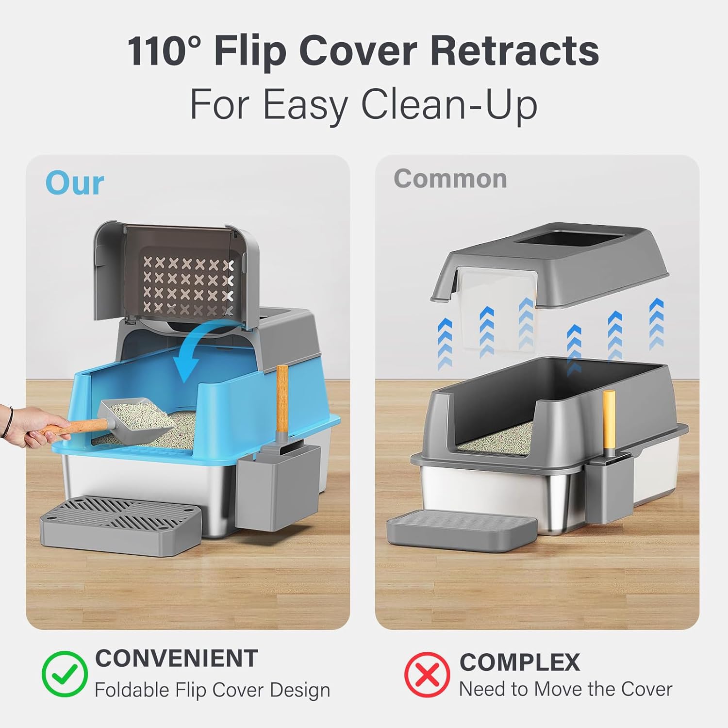 •  【Preferred 304 Stainless Steel】Unlike plastic litter boxes, the high quality and sturdy stainless steel litter box lid prevents odors, is more durable and easier to clean, and can even last up to 5+ years of service life. The stainless steel litter box with the included anti-slip sticker ensures that your cat won't shift or tip over when digging