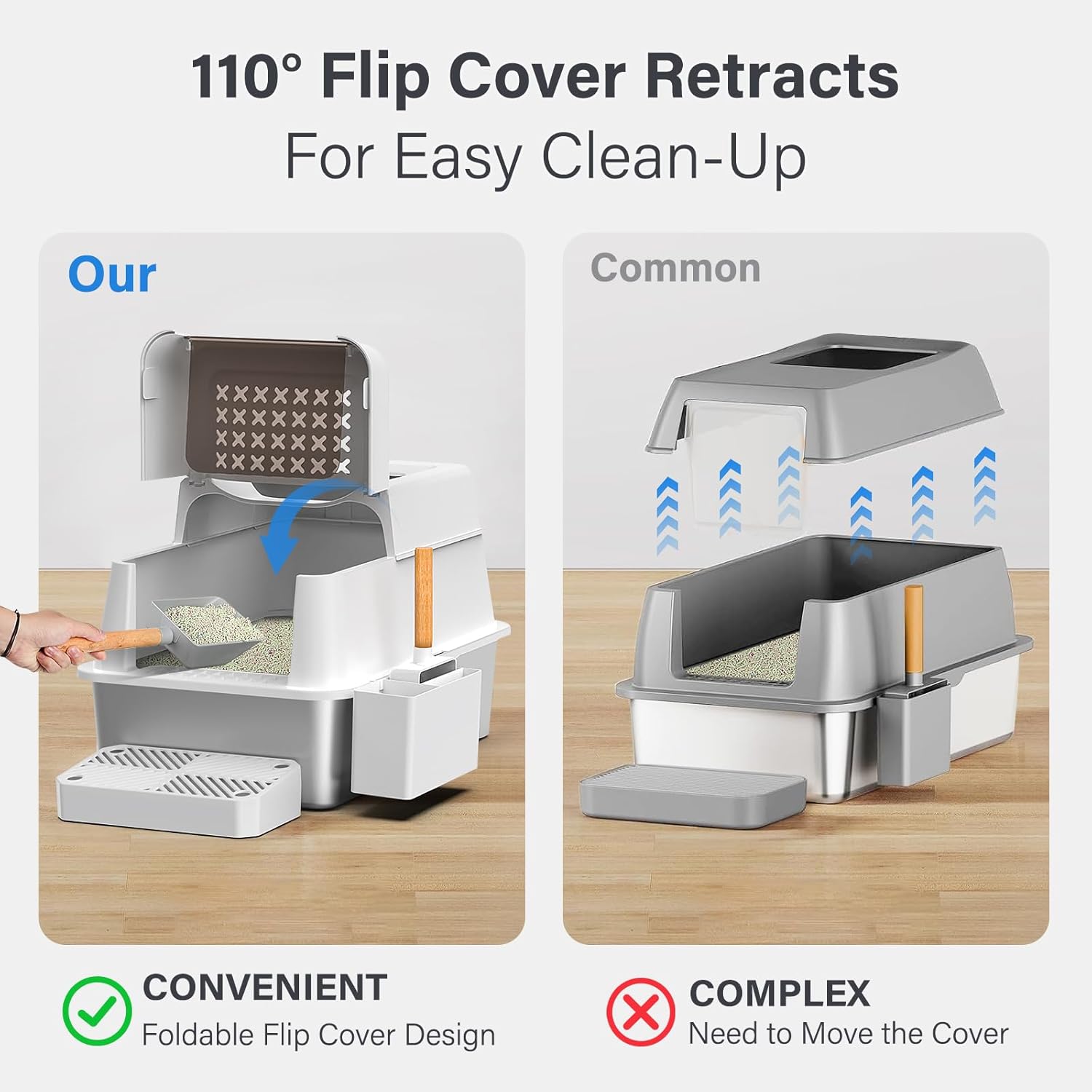 Stainless Steel Litter Box with Lid, XL Extra Large Enclosed Cat Litter Box for Big Cats 110° Flip Cover, Top Entry Metal High Sided Litter Box & Pedal & Scoop, Anti-Leakage (Grey)