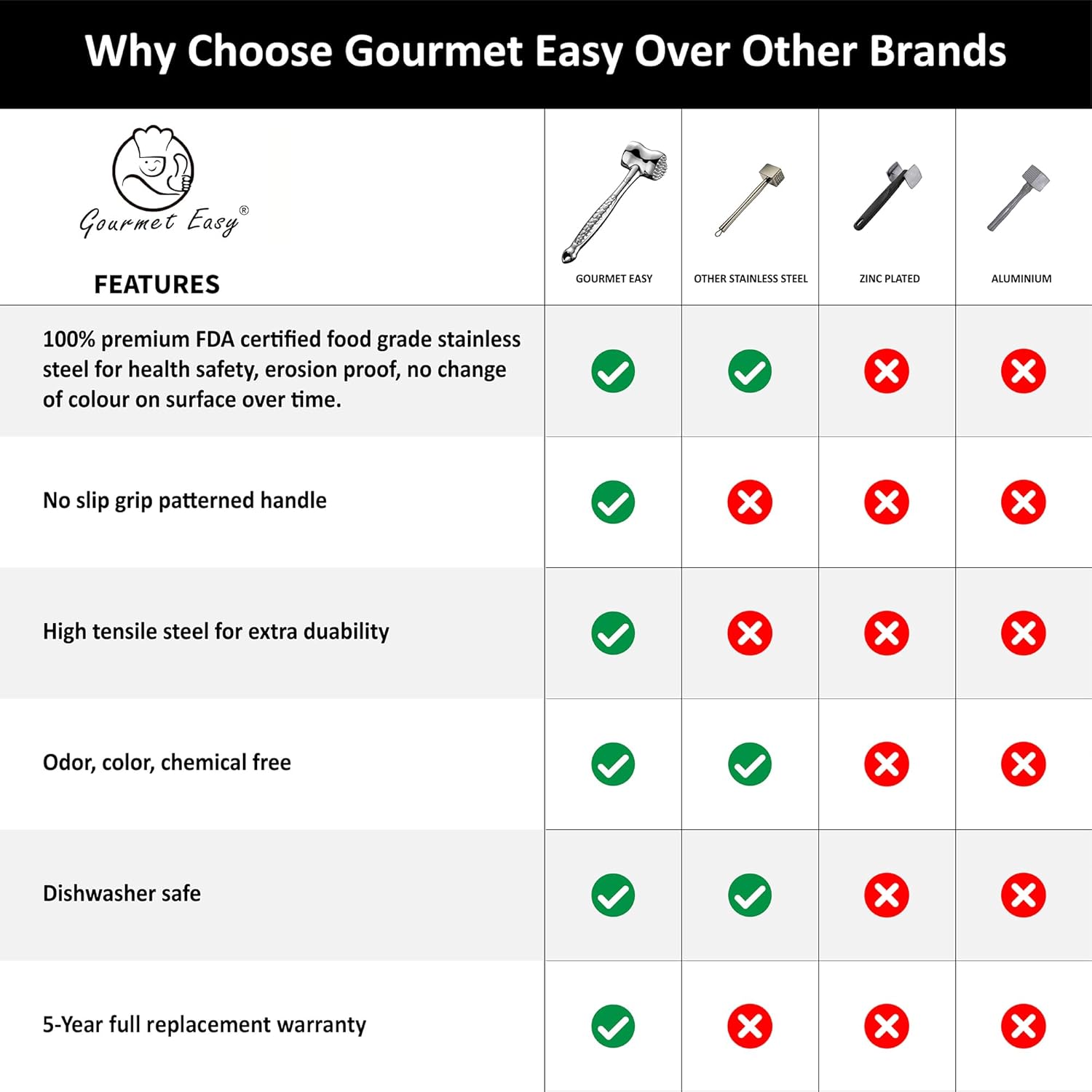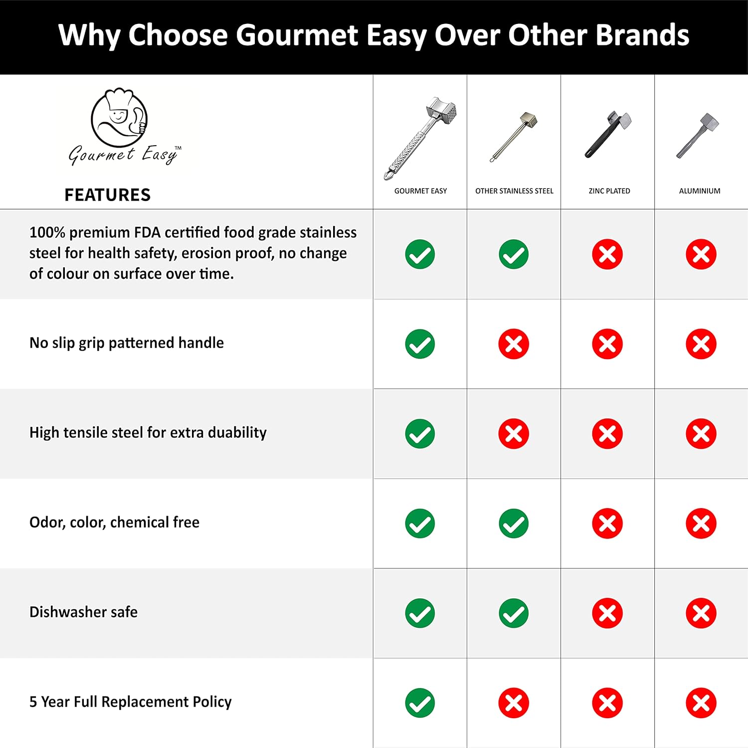 - BUILT TO LAST: 100% Stainless steel meat hammer tenderizer tool (304) crafted for exceptional durability & performance! We at Gourmet Easy use the highest-grade materials and innovative design to ensure that it will last a lifetime! A versatile ground beef smasher & a must-have cooking tool!