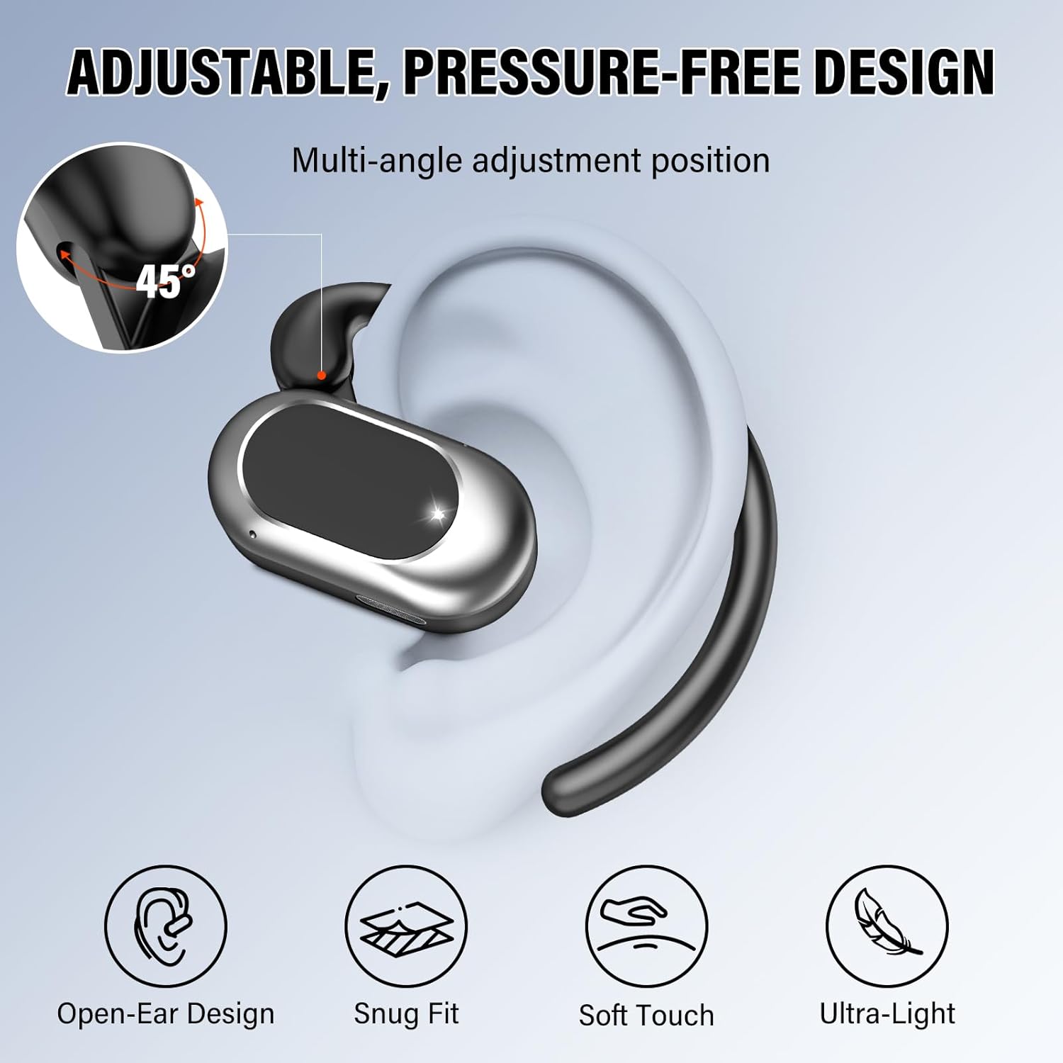 Ergonomic Open-Ear Comfort: This open earbuds feature a unique shape that doesn't plug into the ear canal, ensuring prolonged comfort during wear. Soft, adjustable ear hooks ensure a snug fit for all activities and everyday life without pressing on glasses. The open ear bluetooth headphones will also allow you can easily perceive the changes in the surrounding environment while enjoying the music, ensuring the safety and comfort of use. Ideal for outdoor activities and active lifestyles.