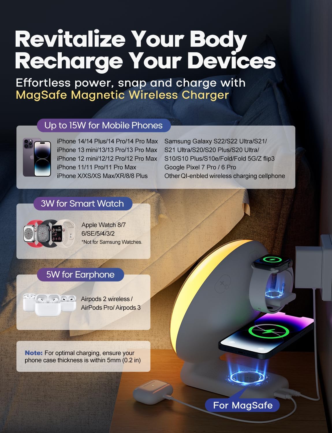 - Wind Down Before Bed: Unwind with our bedside clock's sunset simulation, calming ambient lighting, and soothing sounds. Sleep aid mode offers pure light or pure sound, with auto-off options from 5 to 120 minutes or continuous all night