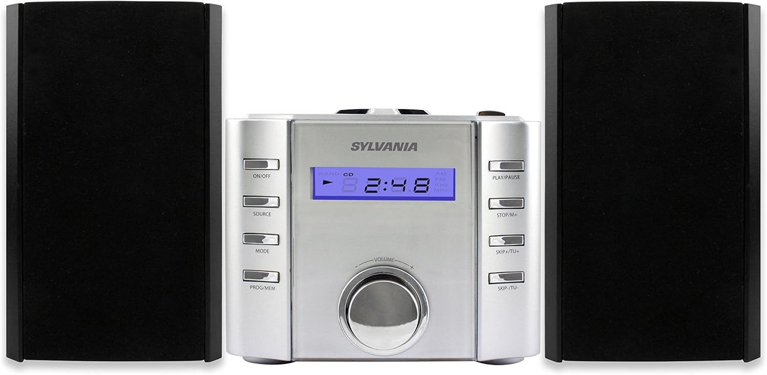 Sylvania has delivered quality again with the Bluetooth CD Microsystem with Radio. It features Hi-Fi speakers and huge stereo sound. The top-loading CD player and detachable speakers knock it out of the park. Enjoy great sound with any Bluetooth-enabled device. Detach the speakers for optimum sound and crank it up.