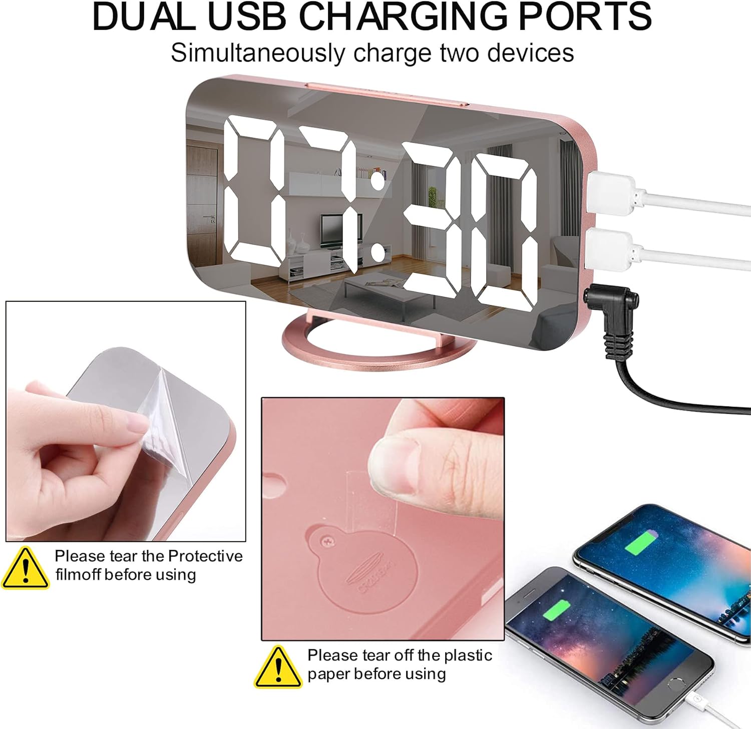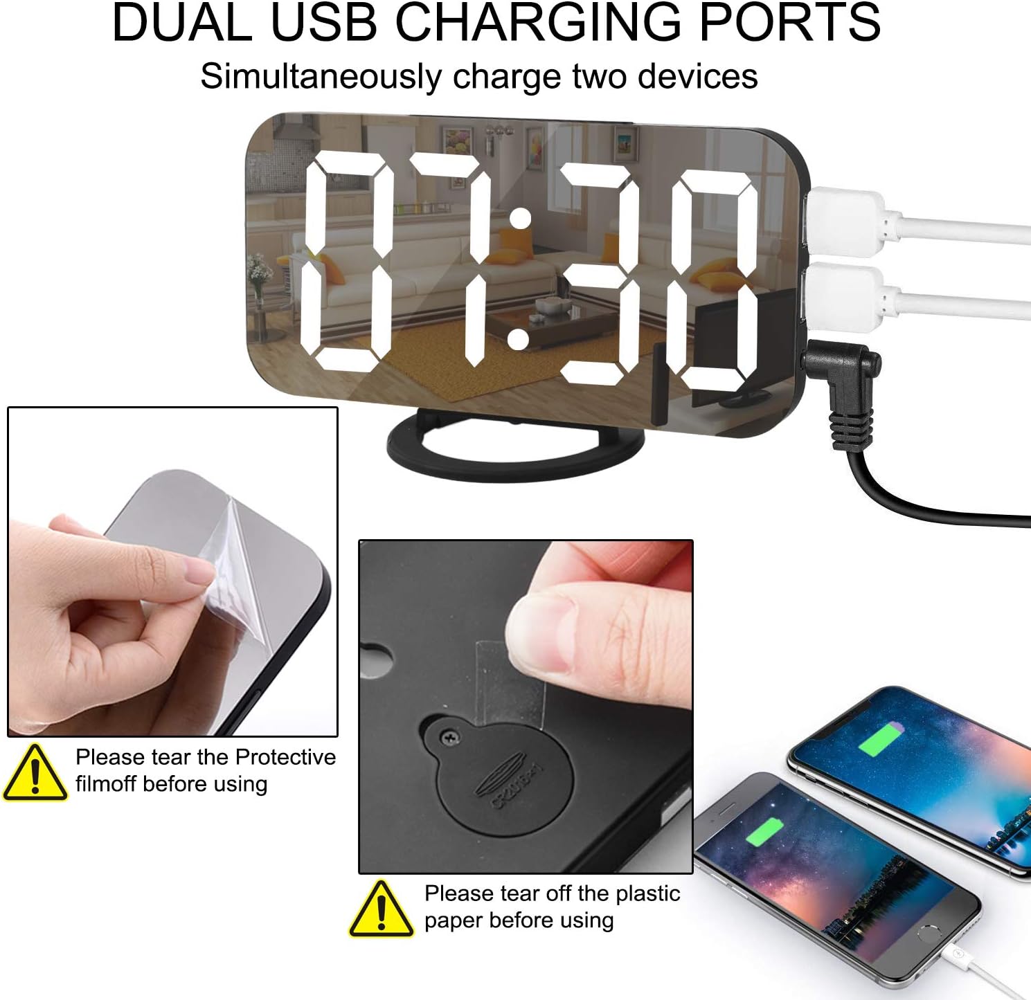SZELAM Digital Clock Large Display, LED Alarm Electric Clocks Mirror Surface for Makeup with Diming Mode, 3 Levels Brightness, Dual USB Ports Modern Decoration for Home Bedroom Decor-Black