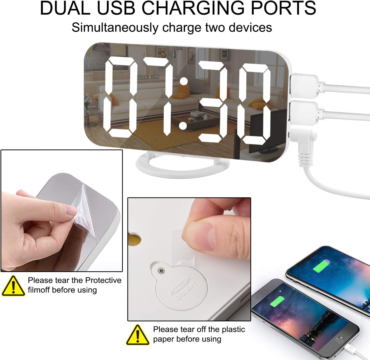 - DIGITAL ALARM CLOCKS MIRROR SURFACE: SZELAM alarm clock combines with makeup mirror, alarm clock and time display function. The HD mirror display can map your beauty, you can also use it as a mirror for your beauty and makeup while watching the time. The specially designed mirror surface is not easy to be stained with ash which can be cleaned with a single rub to restore the original clean appearance. You can put it upright, put it flat or hang it on the wall, just choose the way you like it