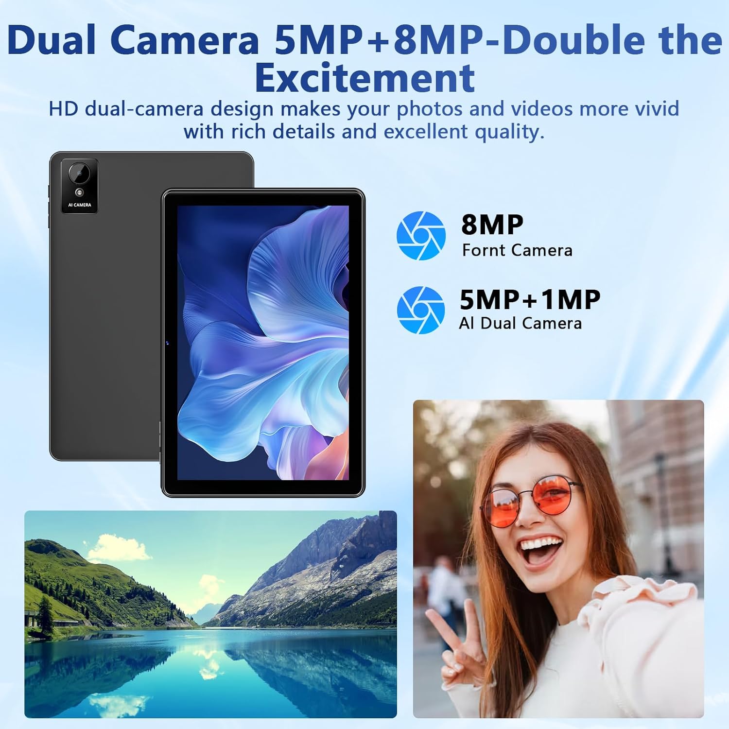 - [Wi-Fi 6 + Bluetooth 5.4] Featuring 6th generation Wi-Fi technology, this Android tablet supports 5G and 2.4G dual-band Wi-Fi, searching for networks quickly and freely to provide a better internet connection with low latency, strong signal and fast speed. It also comes with a clear 5MP front camera and 8MP rear camera for your daily needs, providing you with great photos and clear video chats.