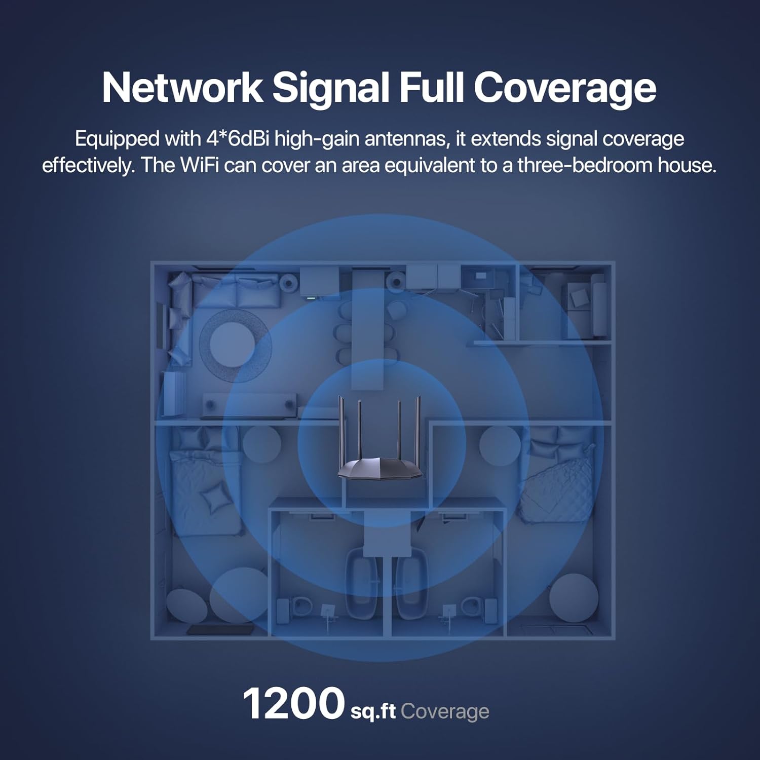 - 𝐒𝐭𝐫𝐨𝐧𝐠 𝐖𝐢𝐅𝐢 𝐒𝐢𝐠𝐧𝐚𝐥 𝐂𝐨𝐯𝐞𝐫𝐚𝐠𝐞— Equipped with Four Powerful 6dbi Antennas and Beamforming technology, wireless router AC6 delivers high speed internet throughout your home