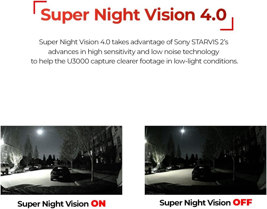 - 【4K FRONT + 2K REAR & SUPER NIGHT VISION 4.0 W/ SONY STARVIS 2 SENSOR】The U3000 delivers improved 4K front and 2K rear recording compared to the U1000, thanks to STARVIS 2 and a more powerful Ambarella CPU. The addition of an adjustable bitrate offers the flexibility to record sharper footage. Also, the U3000 features Super Night Vision 4.0 which takes advantage of STARVIS 2’s high sensitivity and low noise technology to help the dash cam capture clearer footage in low-light conditions.