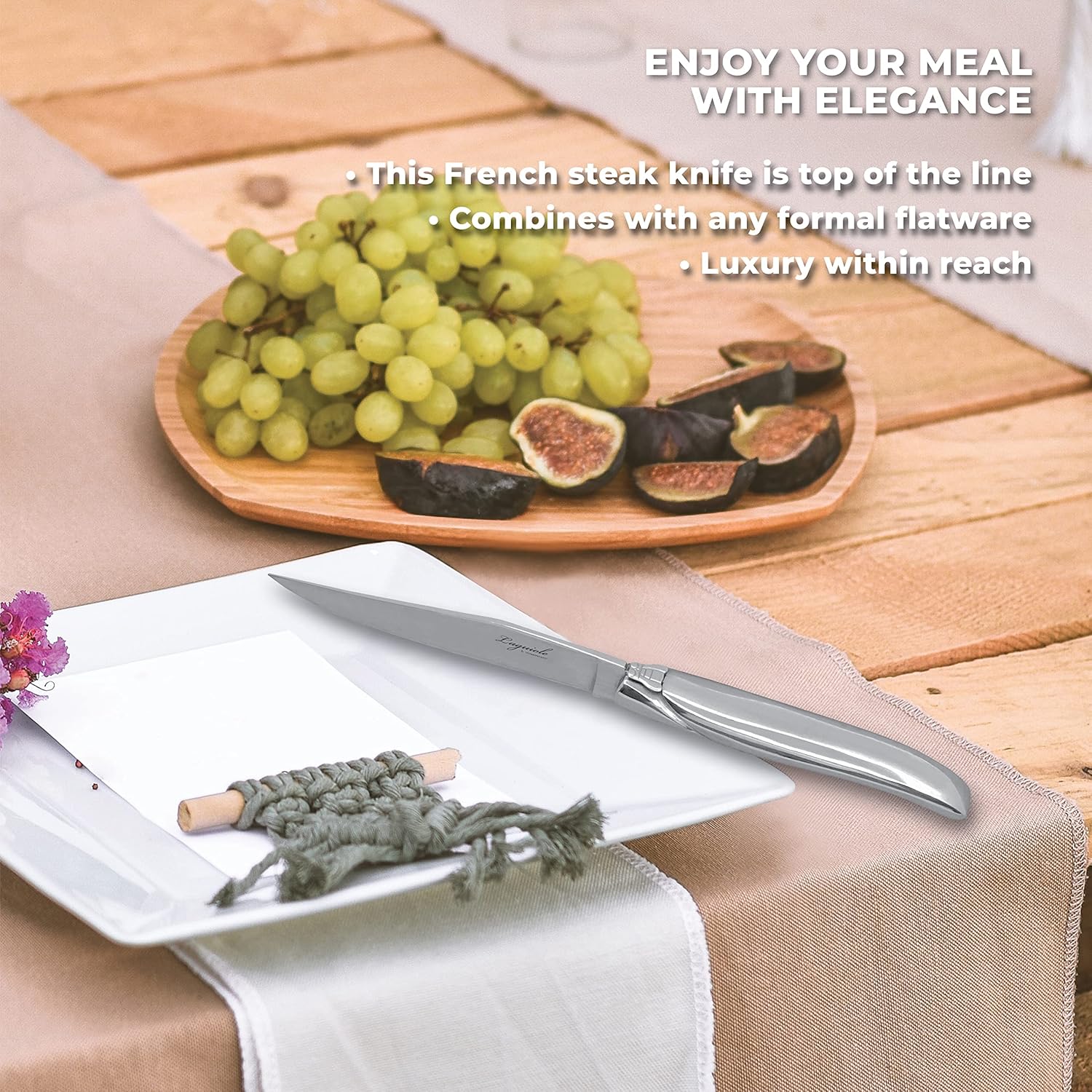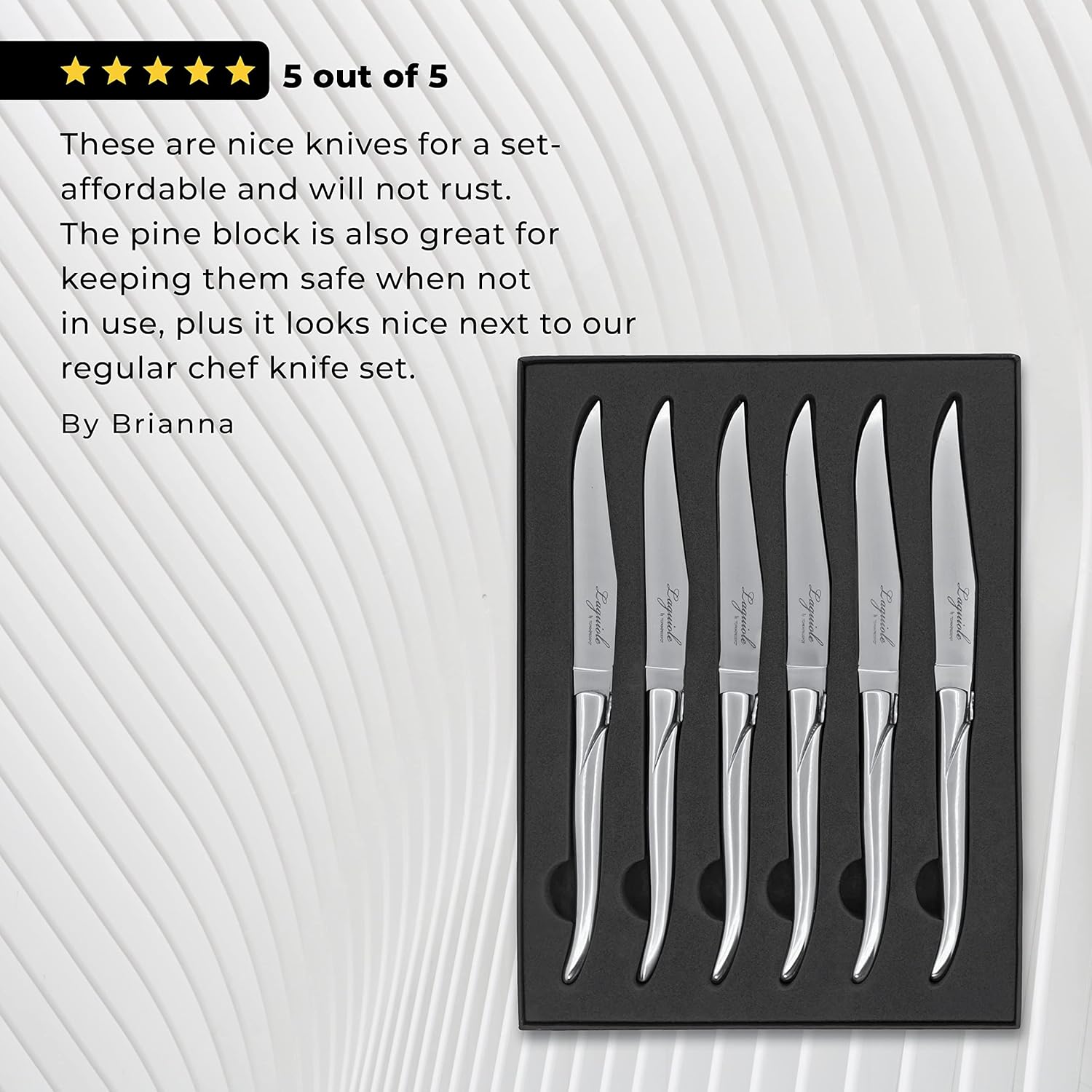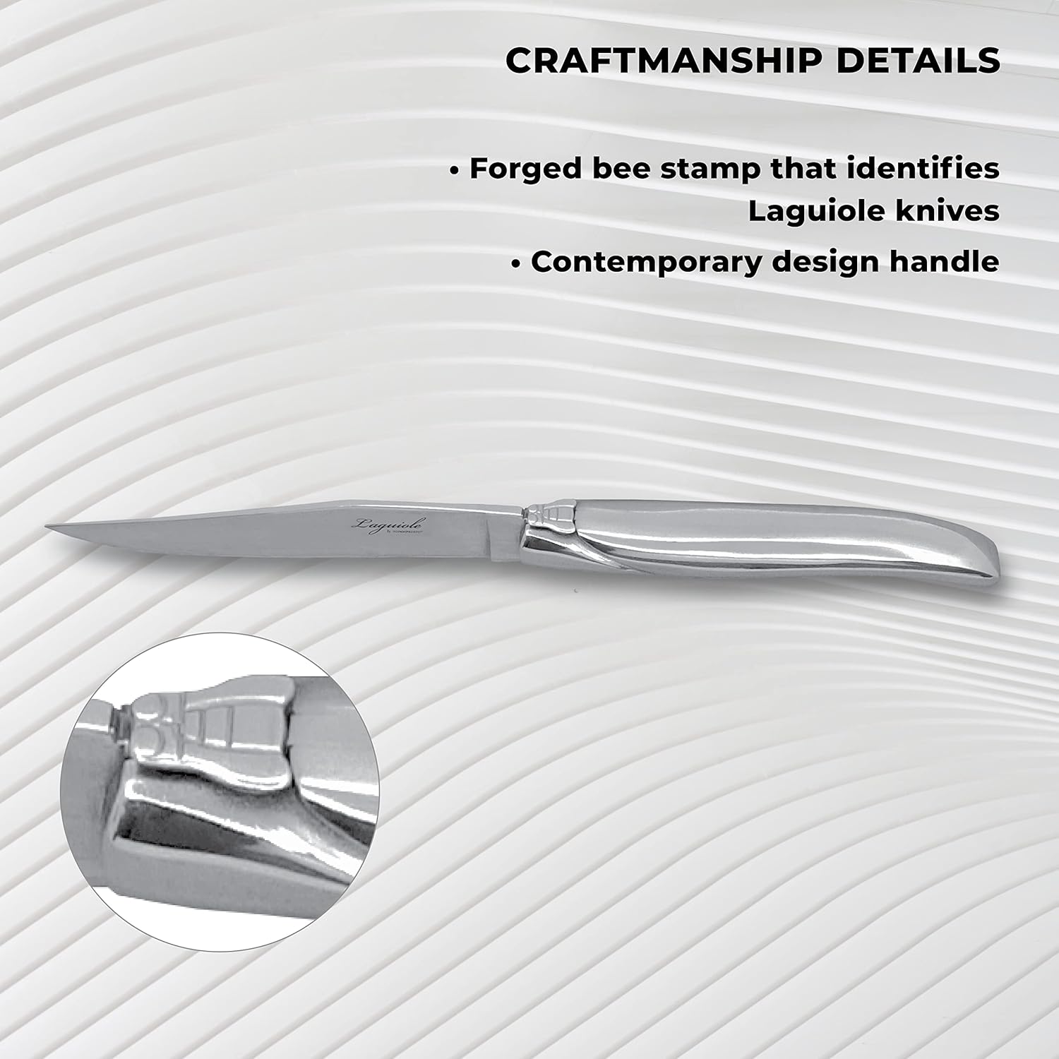 This is one of our top Classic French Laguiole steak knives. It has a stylish design and a significant weight (5.1 oz). It looks good in a formal table setting and it is especially appropriate for a formal dinner. A nice touch for any table or as a gift for people who enjoy steaks. Set includes six (6) knives and a gift box.