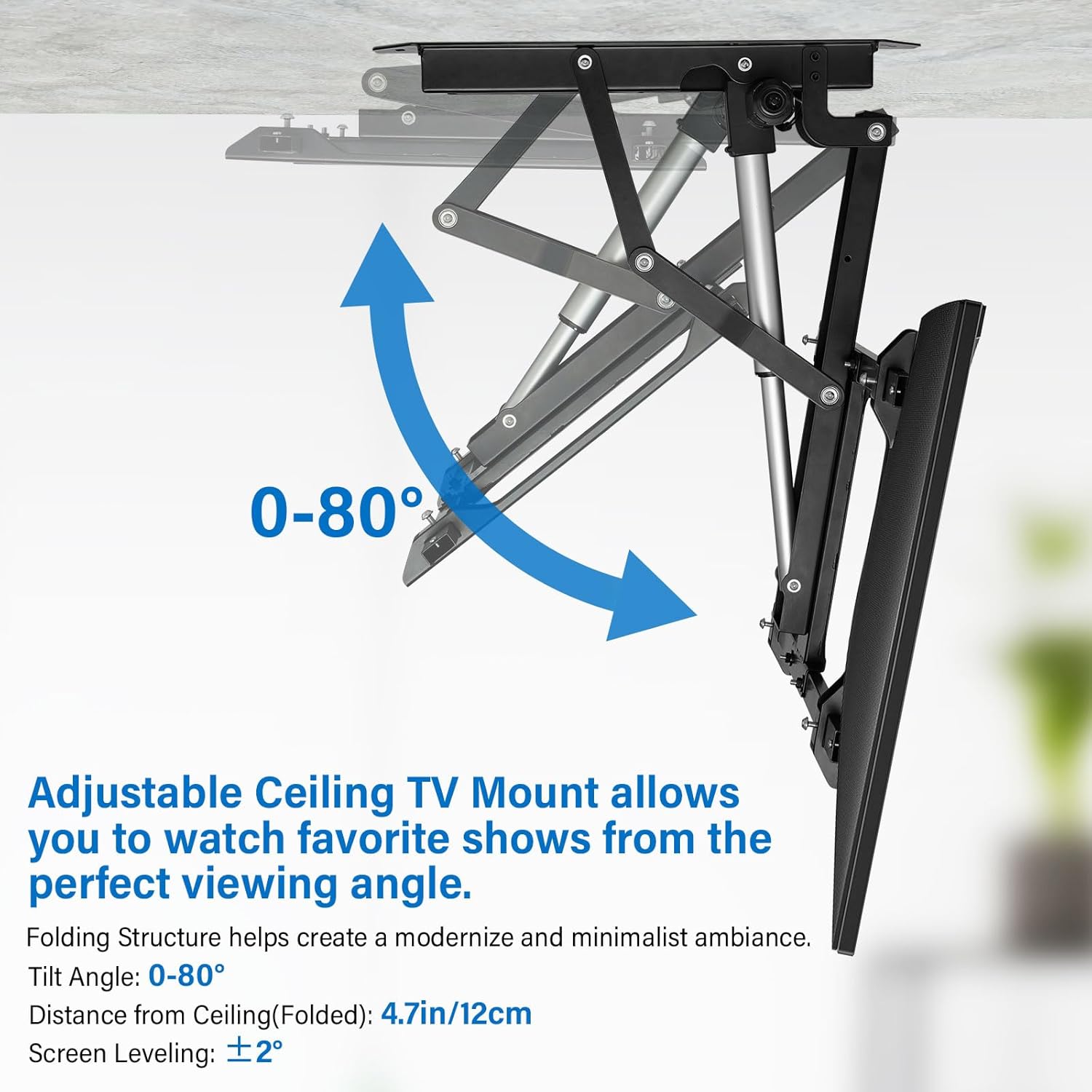 • Space-Saving Design: By mounting your TV on the ceiling and fold it when it’s not in use , you can save valuable floor and wall space, creating a clean and uncluttered look in your living area. And the mount works seamlessly on both flat and pitched ceilings.
