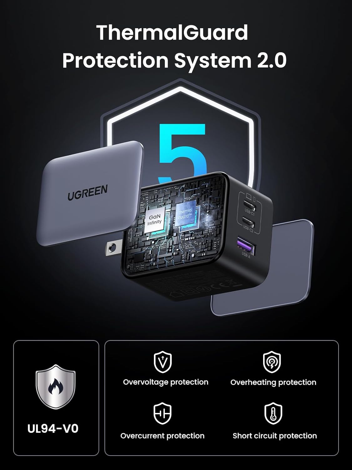 • GaNInfinity Chip: A new generation of GaN technology brings you a faster and more powerful charging experience. Fantastic efficiency with less heat generation in a small, lightweight design. Thermal Guard System 2.0 detects temperature changes in real time and distributes the right current to your device smartly, preventing degradation of the battery life of the device, while ensuring a reliable, fast charge