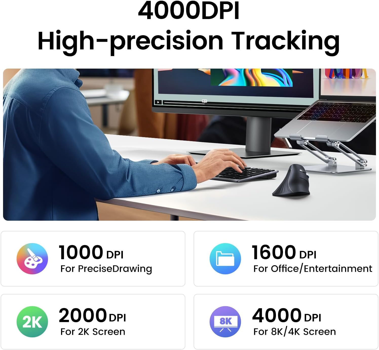 UGREEN Ergonomic Wireless Vertical Mouse with 5 Buttons, Bluetooth 5.0 & 2.4Ghz with USB Receiver, 4 DPI Levels up to 4K, Silent Click, Compatible with Windows, Linux, Mac, Android and Chrome