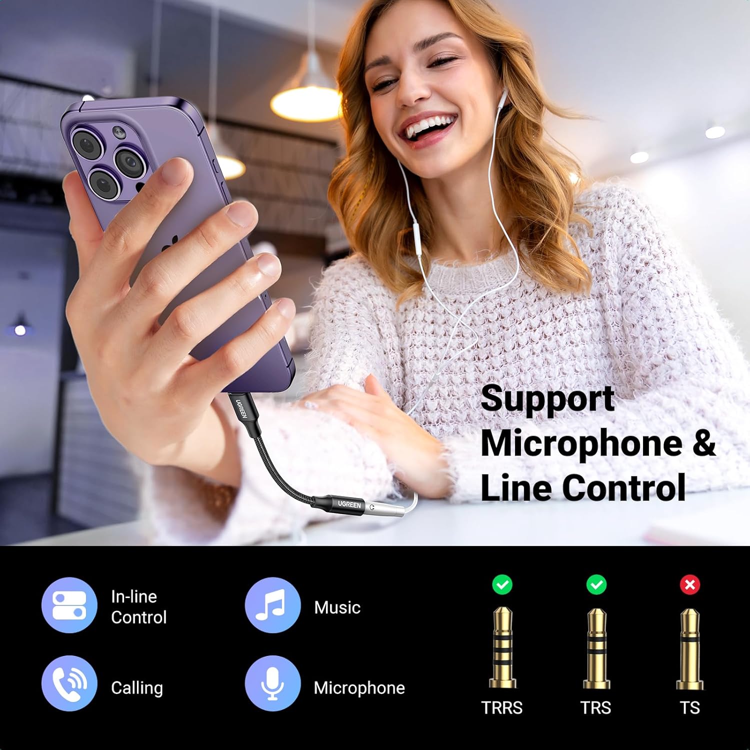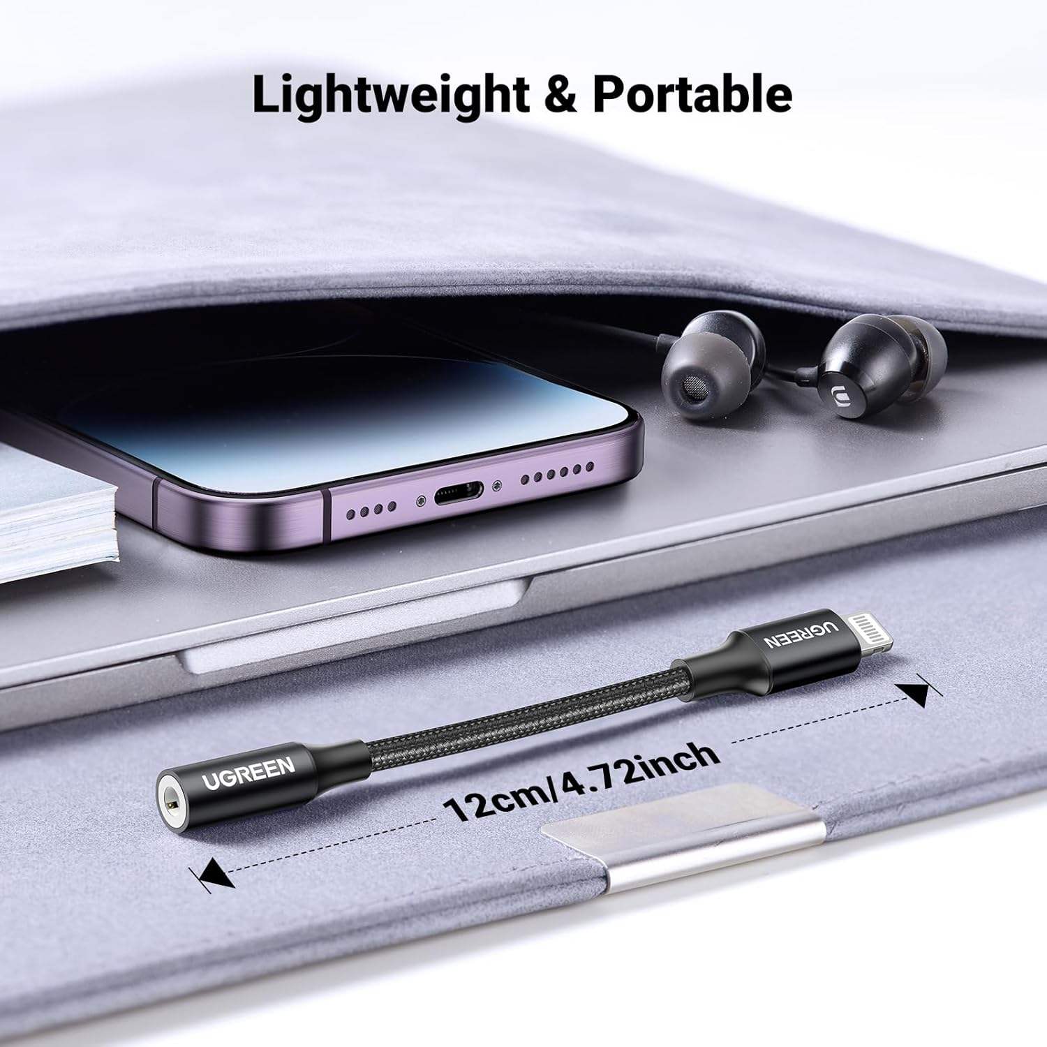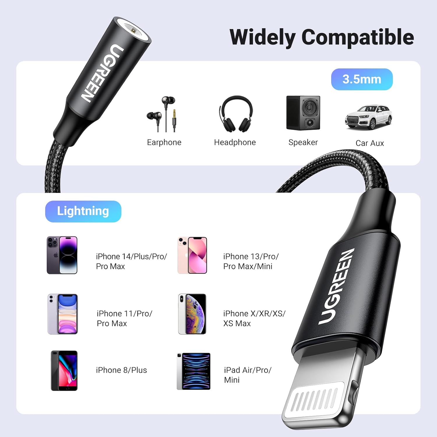 • MFI Certified: UGREEN Lightning to 3.5mm headphone jack adapter can easily connect existing 3.5mm headset to iPhone 14 14 Pro 14 Pro Max 14 Plus 13 13 Mini 13 Pro 13 Pro Max 12 12 Pro 11 11 Pro 11 Pro Max X XR XS XS Max 8 7 for audio and mic without Lightning connector headphone. MFi Certified (PPID: 219693-1009): verified MFI chipset to ensure 100% compatibility with Lightning devices