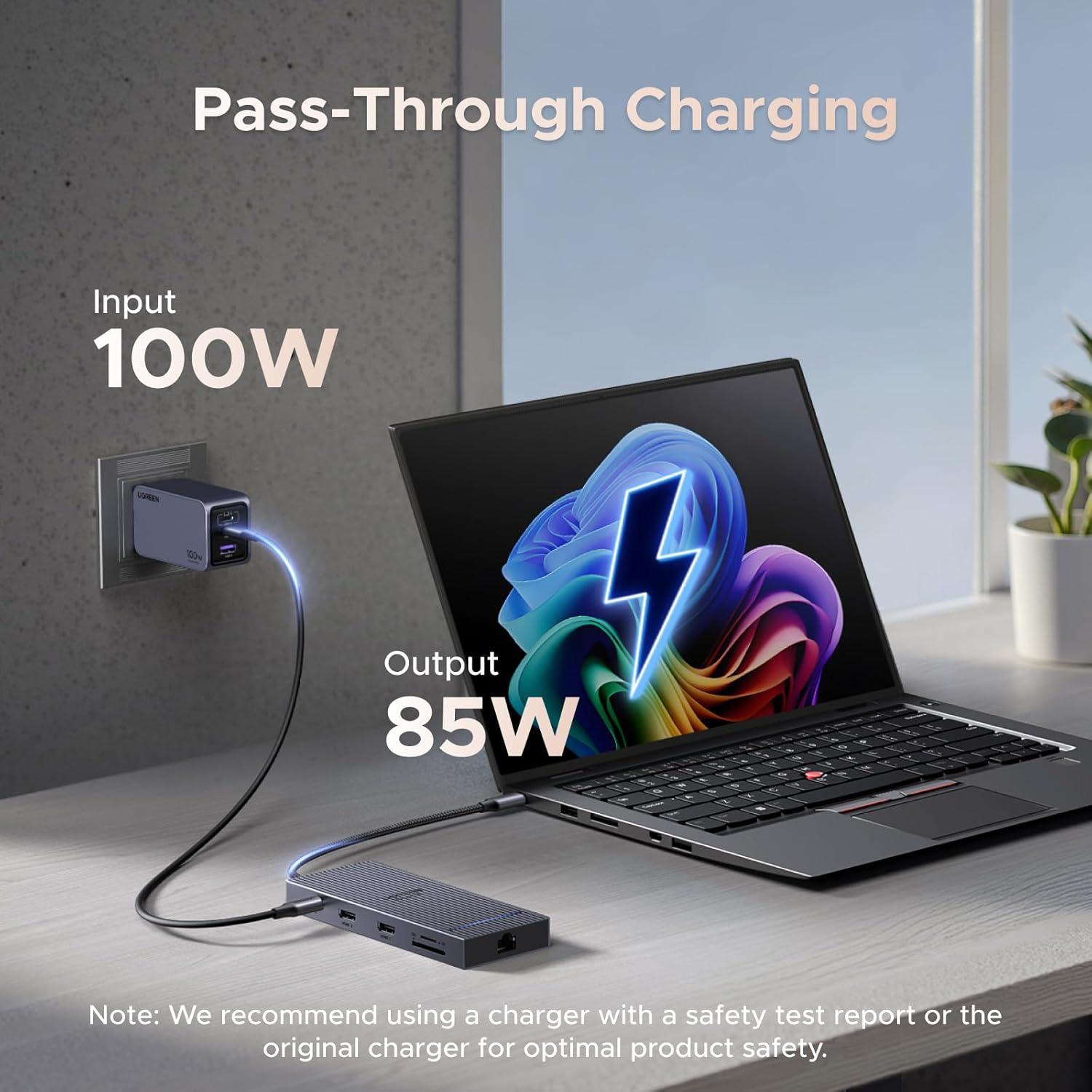 - 100W Power Delivery: The Laptop docking station Supports up to 85W USB C pass-through charging via USB-C PD port, reserves 15W for other interface operation. Additionally, the port only supports charging; it does not facilitate data transfer or video output