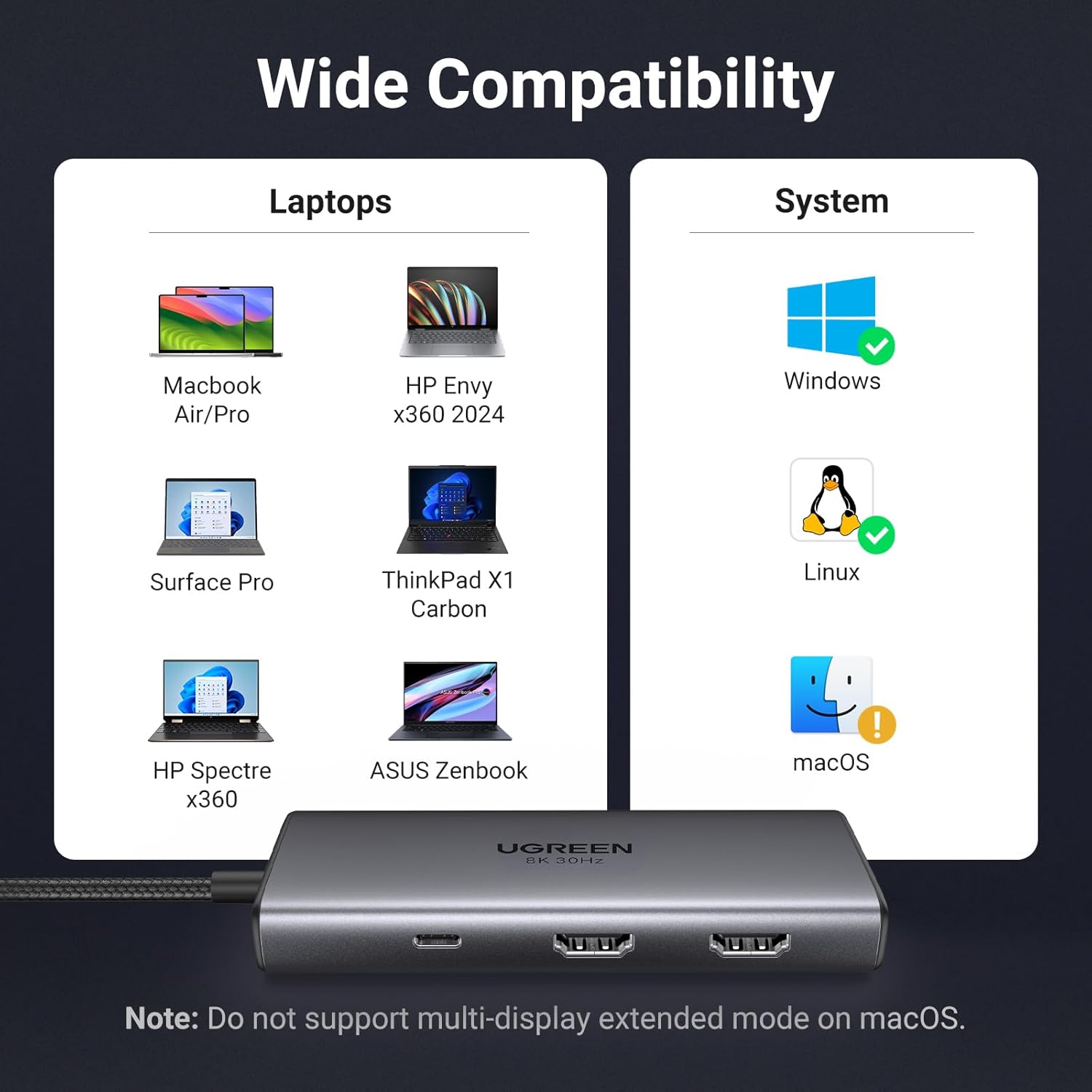 • Note: If you are using a MacBook and want to connect dual monitors with different displays, we do not recommend this docking station. For macOS, the displays on both external monitors will be identical