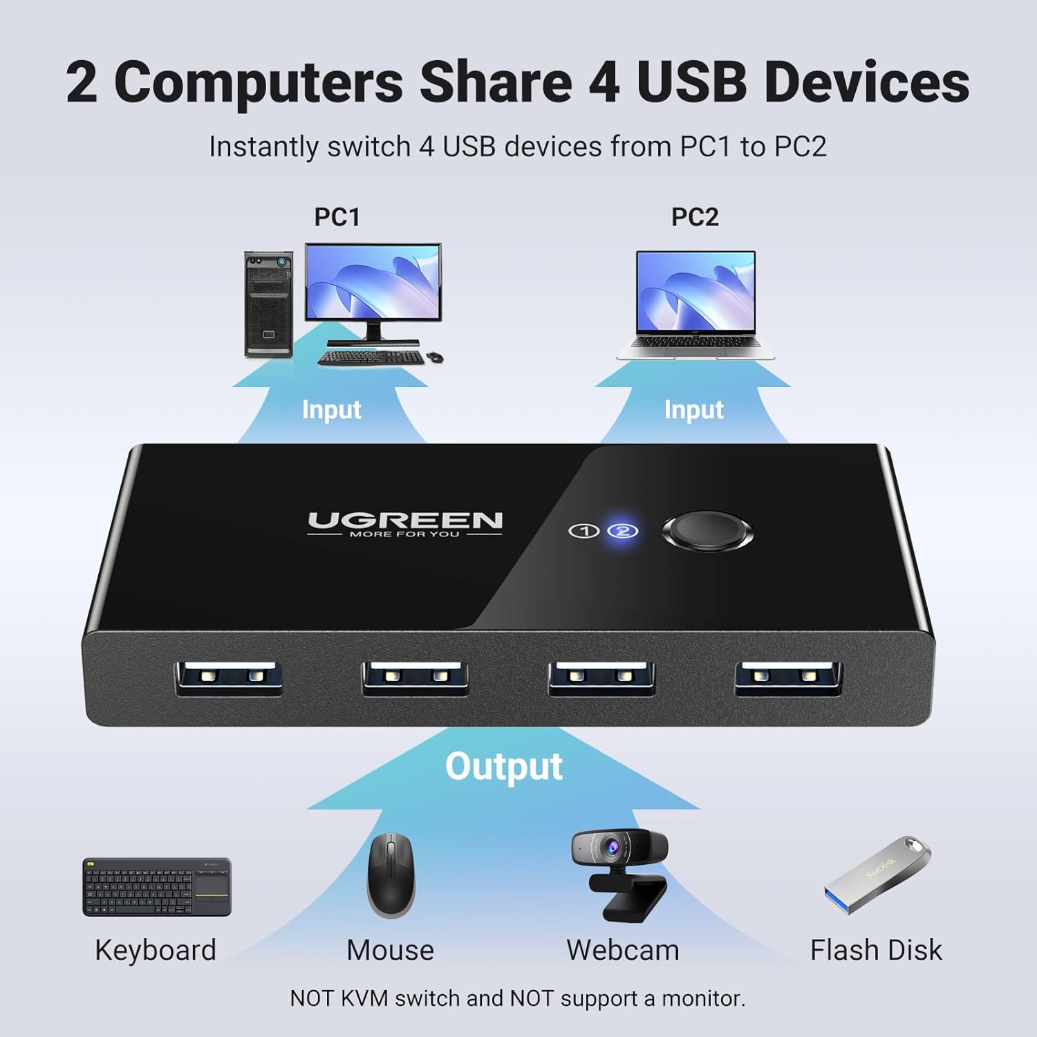 UGREEN USB 2.0 Switch Selector 2 Computers Sharing 4 Peripheral Devices, Switcher Box Hub for Mouse, Keyboard, Scanner, Printer, PCs with One-Button Swapping and 2 Pack USB A to A Cable