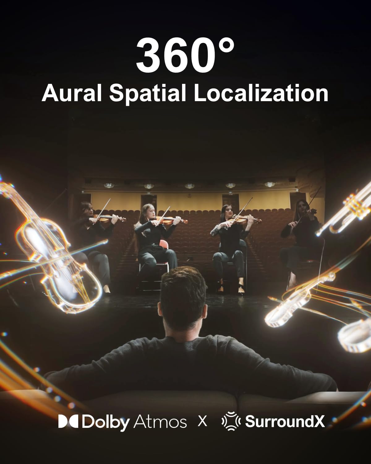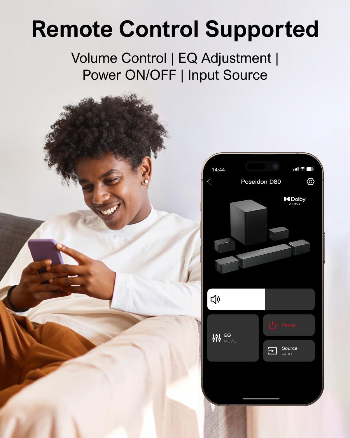 • Dolby Atmos for a True 3D Soundscape: Unlike conventional stereo systems, the Poseidon D80 leverages Dolby Atmos technology to dynamically adapt the audio to your space. Whether watching movies or streaming shows, its 3D positioning algorithms place sound elements around you with precision, creating a 360° sound environment that puts you right in the action.