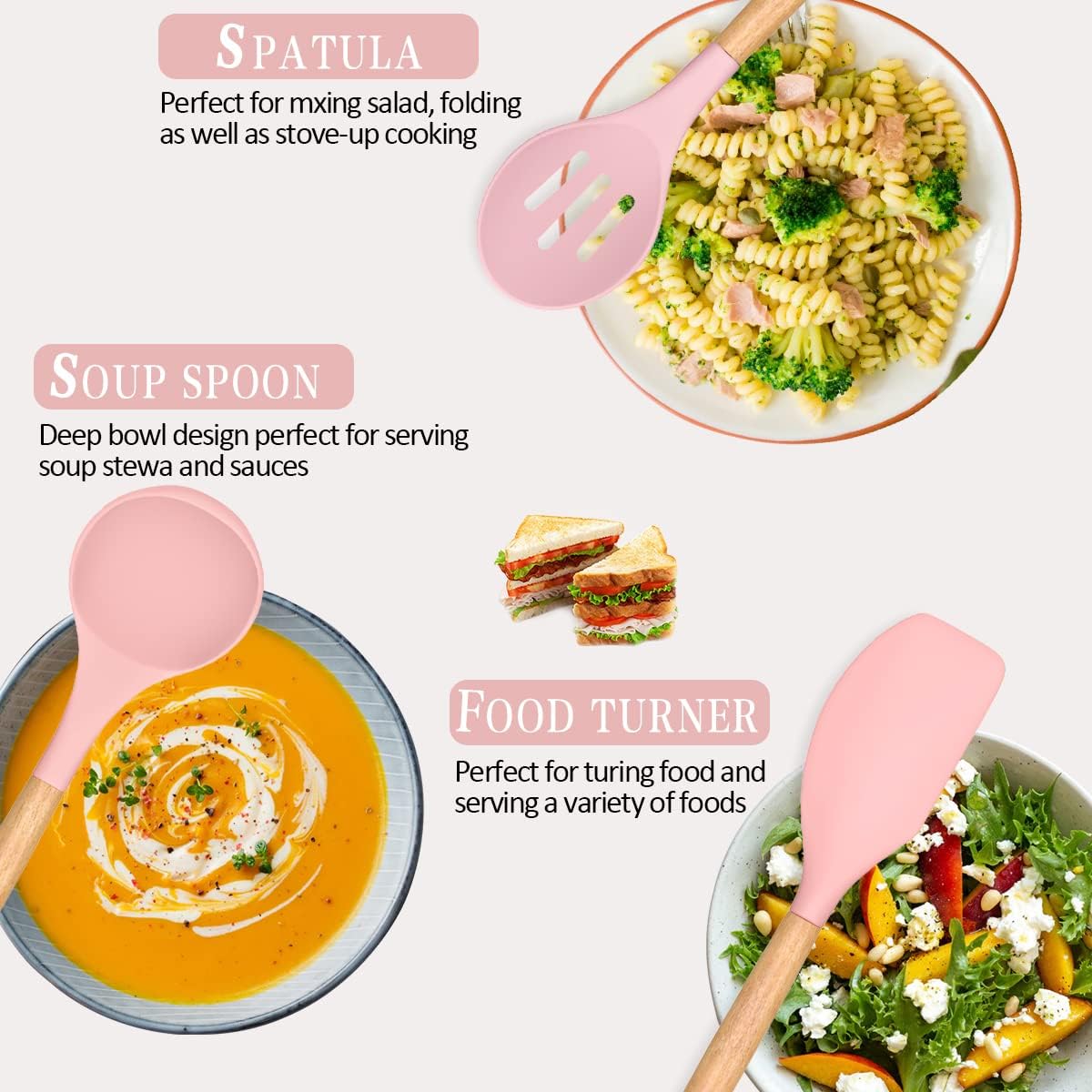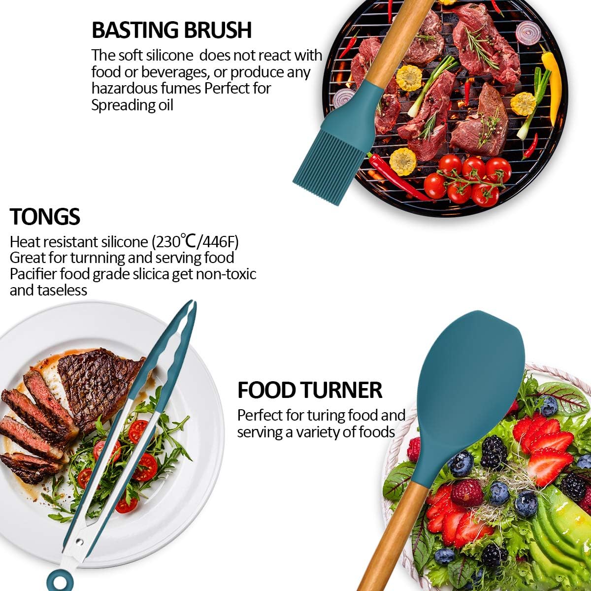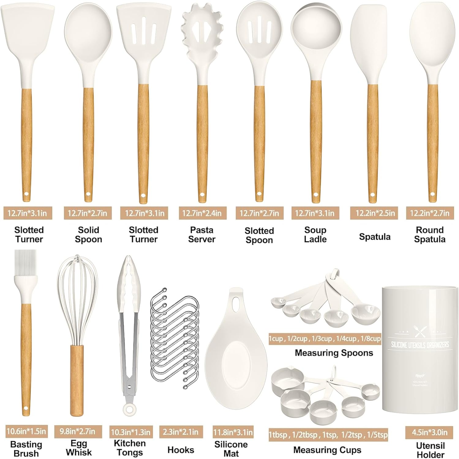 - 33 DURABLE WOODEN HANDEL KITCHEN UTENSILS SET - Anti scalding protect your hand from burning, 33 professional silicon Kitchen utensil set includeshe set includes flexible spatula, soup ladle,serving spoons pasta server, spatula turner , tongs, mesuring cup and spoons, 10 hooks, silicone mat and so on. Meet your all kinds of kitchen needs