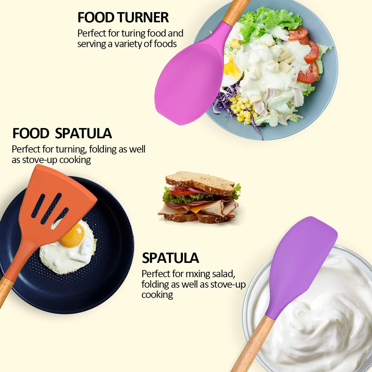 - FOOD GRADE SILICONE - Made of food-grade silicone, BPA-free, can use in any type of food. And it will probably last longer than the other plastic kitchen utensils. This silicone cooking utensils does not react with food or beverages, you don't have to worry about the health of your families will not retain odors or colors when you use it for stirring tomato-based food products