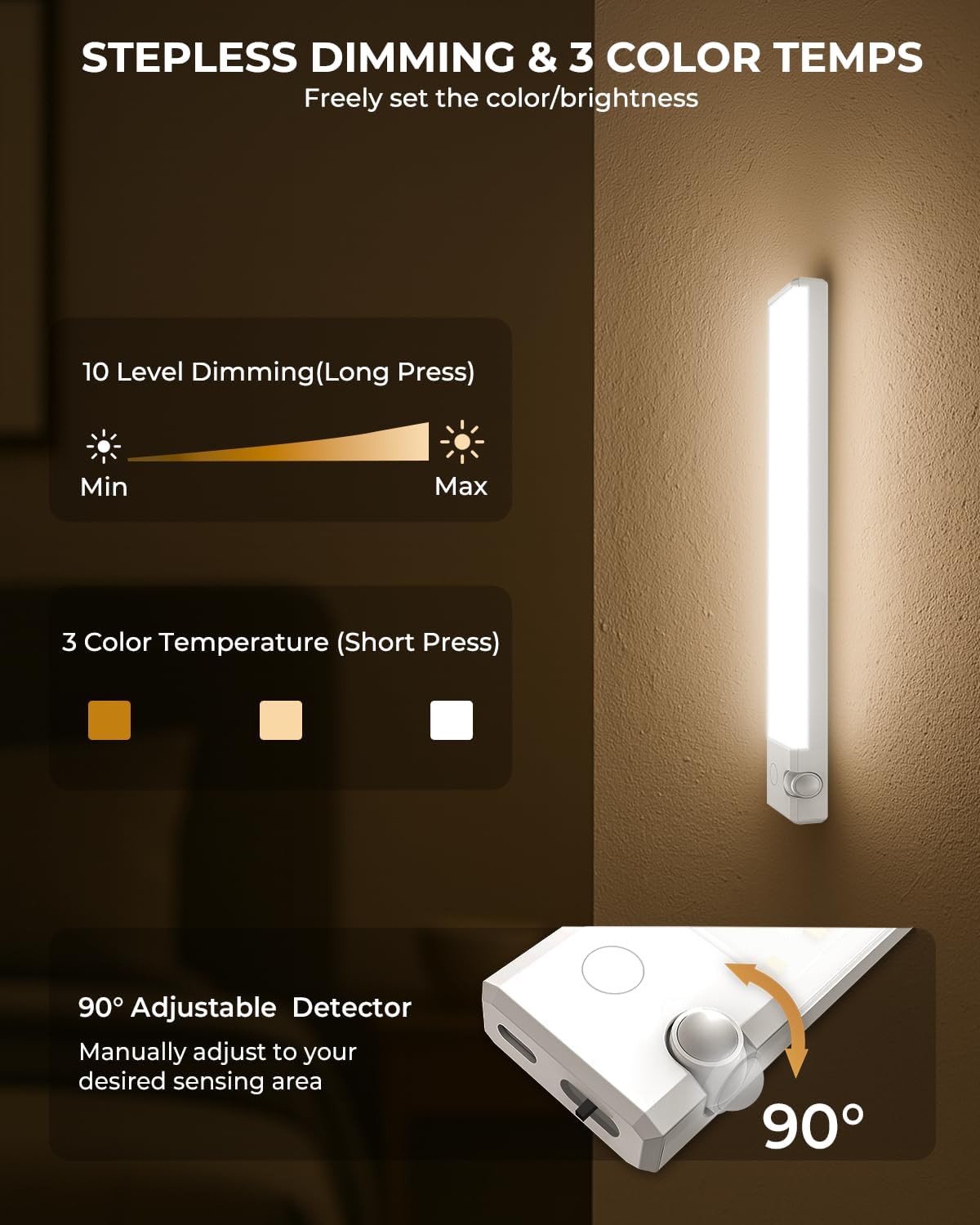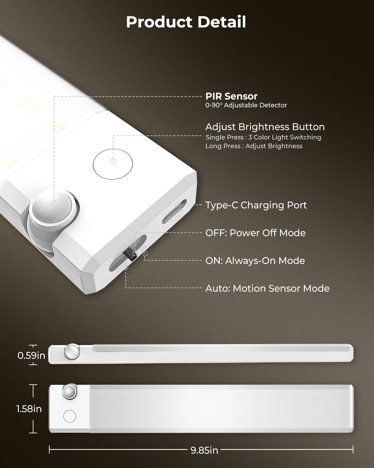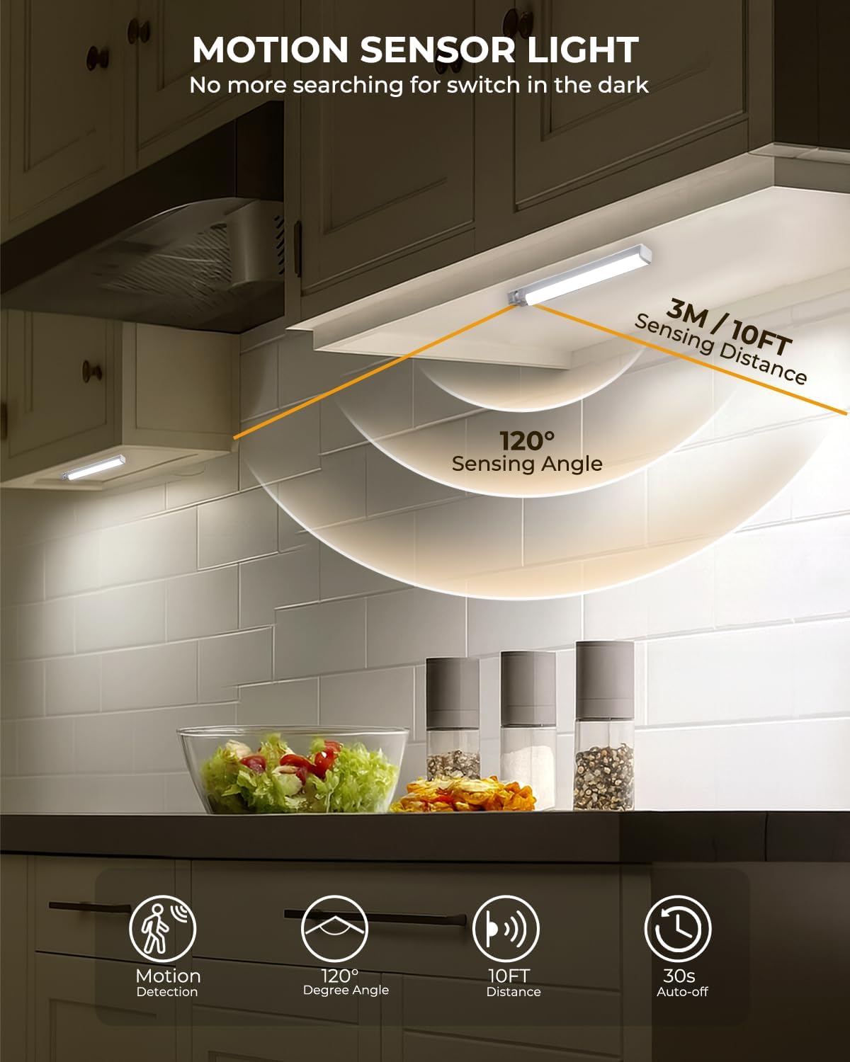 - Smart Motion Sensor Technology: Detects movement up to 10 feet with a 120° range. Auto-off after 30 seconds in dark settings using “AUTO” mode.