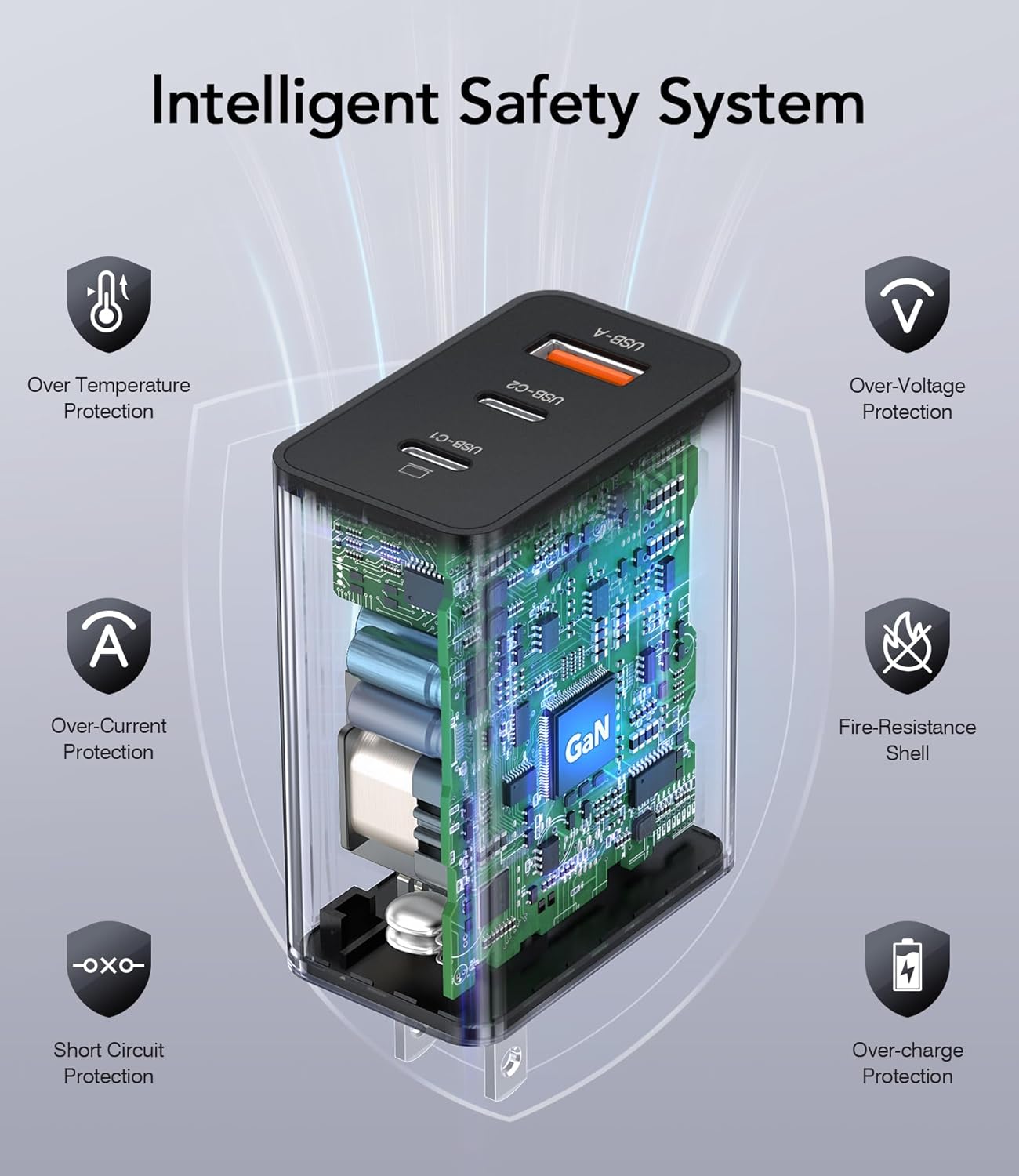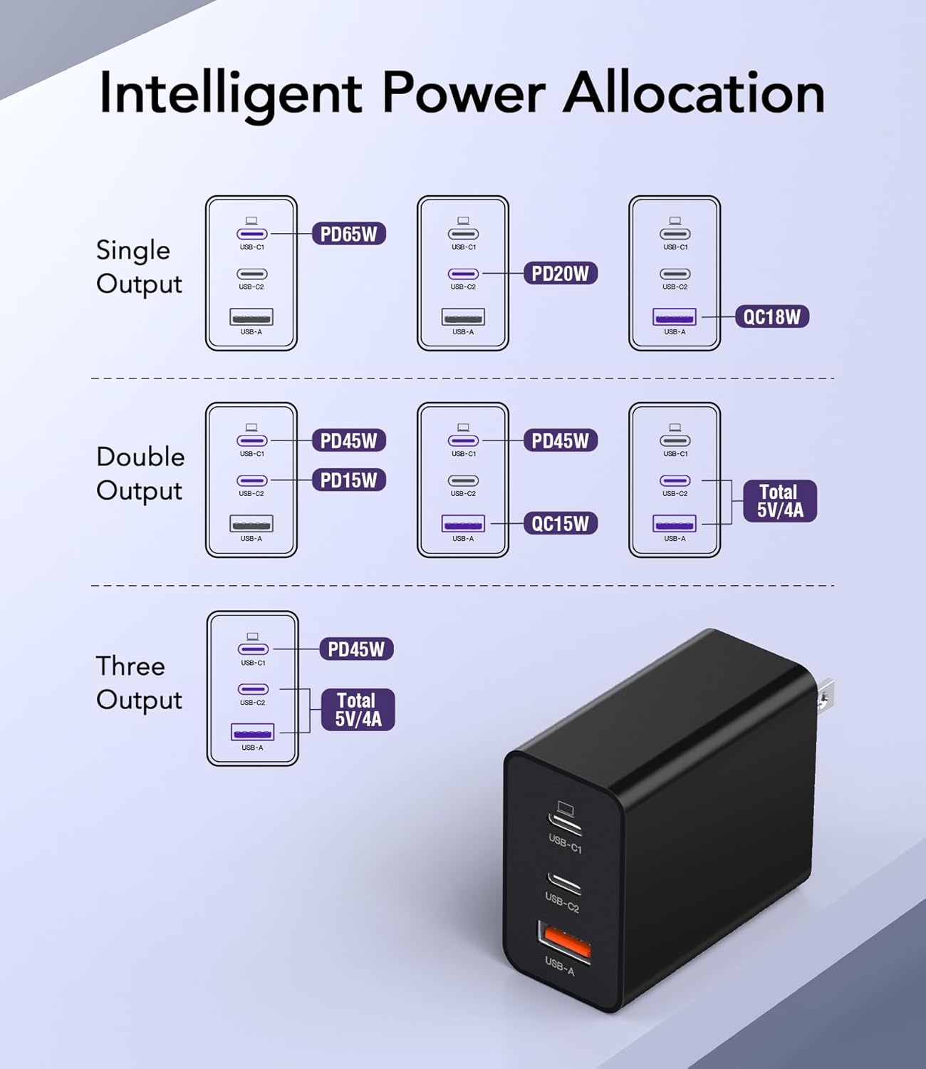 - Efficient and Fast Charging: This 65W USB C charger powers your devices at lightning-fast speeds. With a maximum single-device output of 65W, it takes just 2 hours to fully charge a MacBook Pro and only 25 minutes to charge an iPhone 16 Pro Max to 55%. This charger supports PD3.0, QC3.0, and Samsung Super Fast Charging (PPS), maximizing charging efficiency and providing an unparalleled charging experience