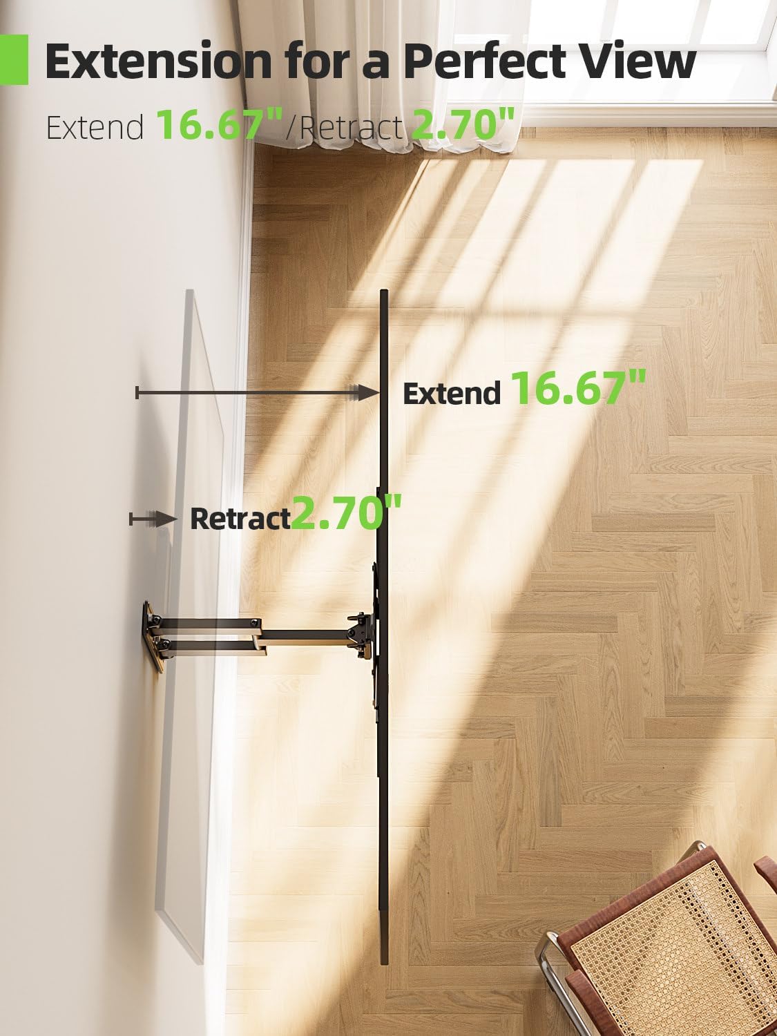 • SAVING SPACE:TV mounts can pull out to 16.7"or retract back to 2.7" from the wall. Manage TV cables orderly through the velcros,which save valuable space for you and make your house look neat.