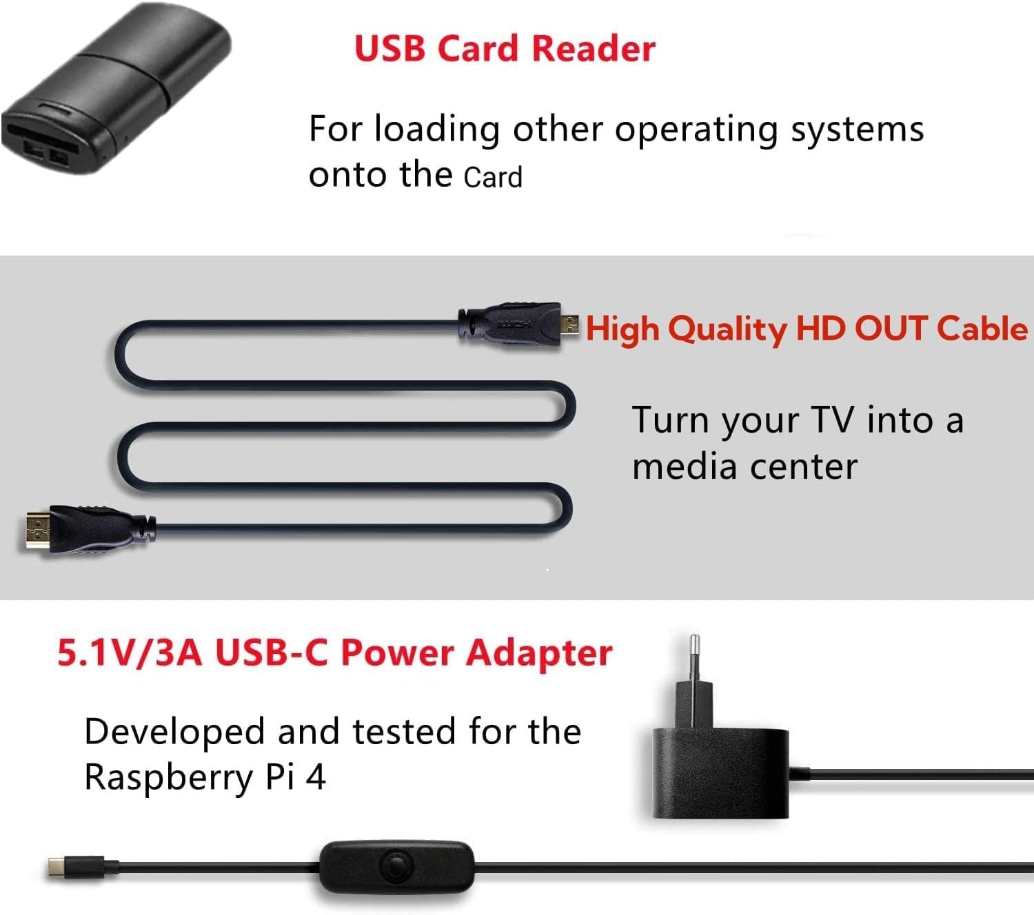 - 【Package Included & Service】1 x Raspberry Pi 4 B board (4GB), 1 x 32GB Card, 1 x Card Reader, 3 x Heatsinks, 1 x ABS Black Cover, 1 x Network Cable, 1 x HD OUT Cable, 1 x Fan ,1 x Power Cable with switch, 1 x screwdriver. The 32GB card is in the package of the Raspberry Pi motherboard. If you have any questions, please feel free to contact us by email.