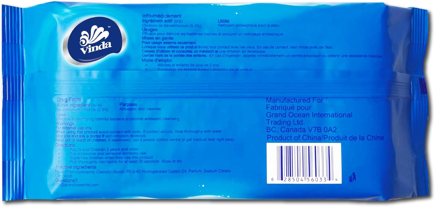 Vinda Antibacterial Wipes are effective in destroying harmful bacteria to provide antiseptic clean jobs. You can keep in cars, purses, at work and even when you travel. Vinda Antibacterial Wipes can be using for a quick and easy way to clean up hand, anytime, anywhere when soap and water are not available! Alcohol and bleach-free formula is gentle enough for sensitive skin. Keep out of reach of children and pets. Always Use as Directed. DIN: 02501074