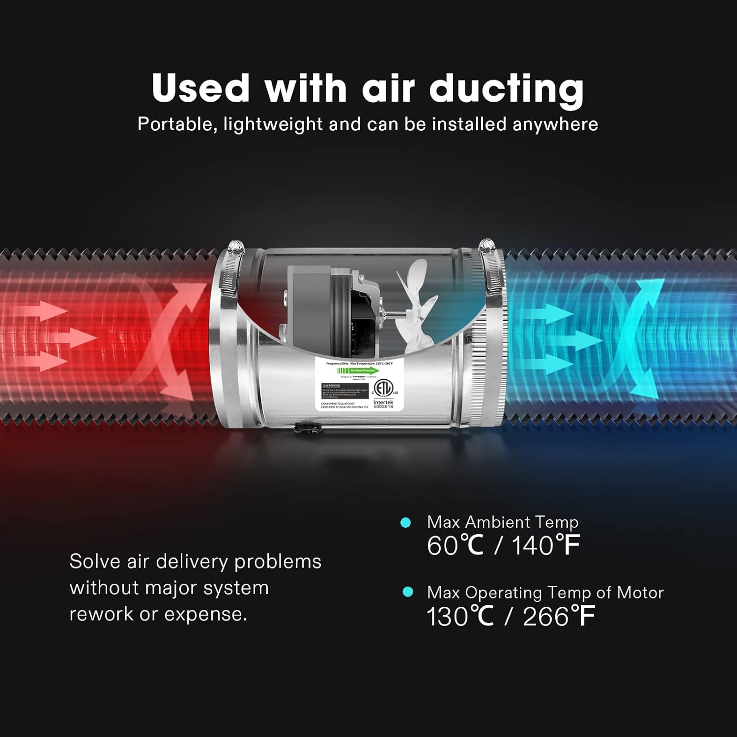 • Wide Applications: You can have it in bathrooms, kitchens, workshops, basements, attics and etc, in order to boost airflow in HVAC systems to remove exhausts; Also, it can be used in grow rooms as intake fans to bring fresh air or exhaust fan in smaller setups with LED or other grow lights under 400W