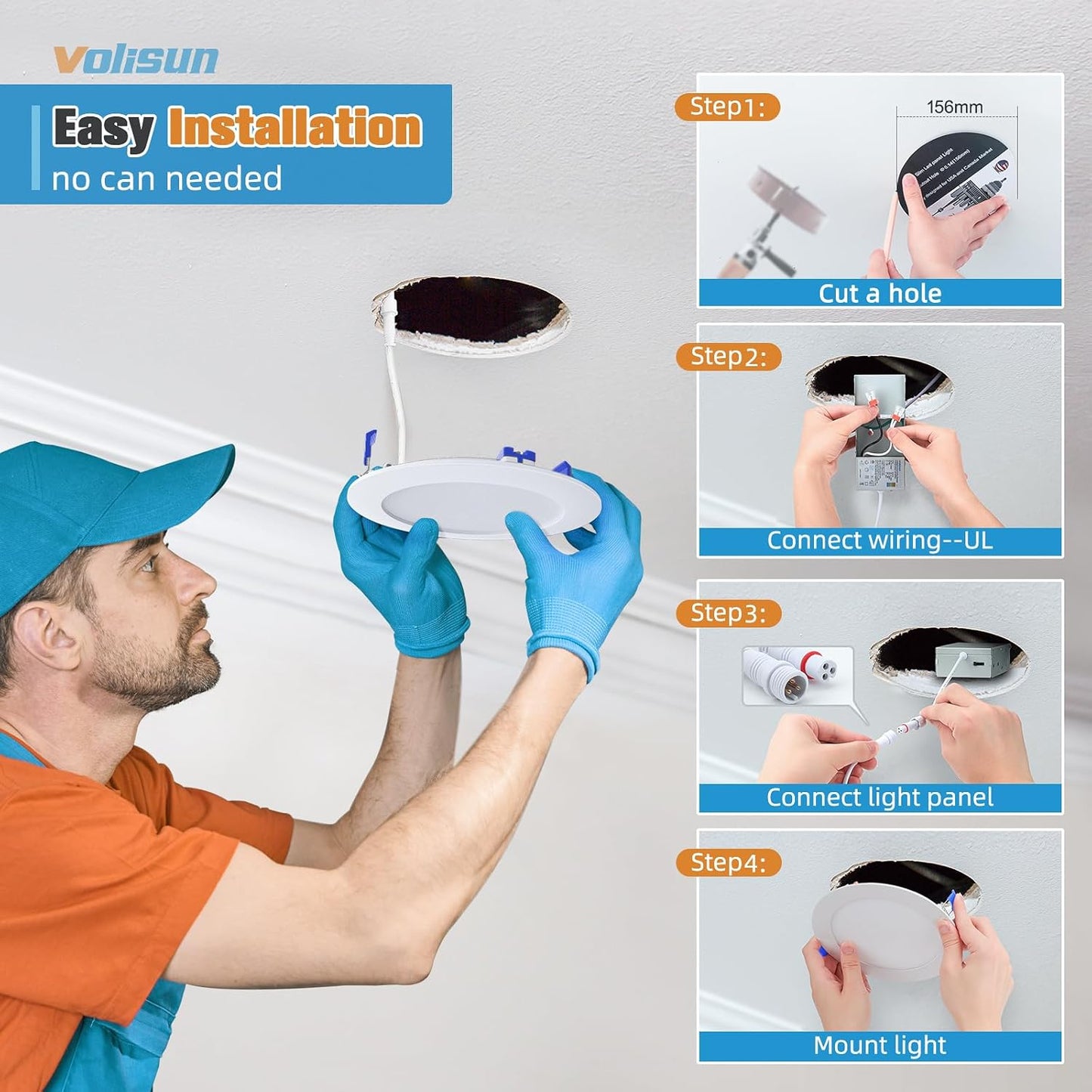 【Easy Installation】Volisun's 6 inch slim recessed lighting led is suitable for retrofit and new decoration: Cut a hole in ceiling with 1:1 hole template; Connect the Jbox to the cable; Use spring clip to fix it on the ceiling. It only requires as small as 2 inches ceiling spaces, fits various ceilings, and joists. Recessed can is no longer a limitation of your choice.