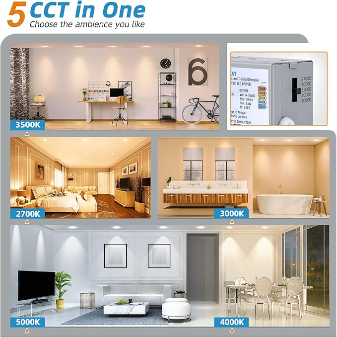 【5 Color Temperature】Just a slide on the side of the box, and choose 2700K/3000K/3500K/4000K/5000K-5 color temperature selectable to meet your mood, erasing the trouble of returning or replacing 6 inch led recessed light due to improper color temperature.