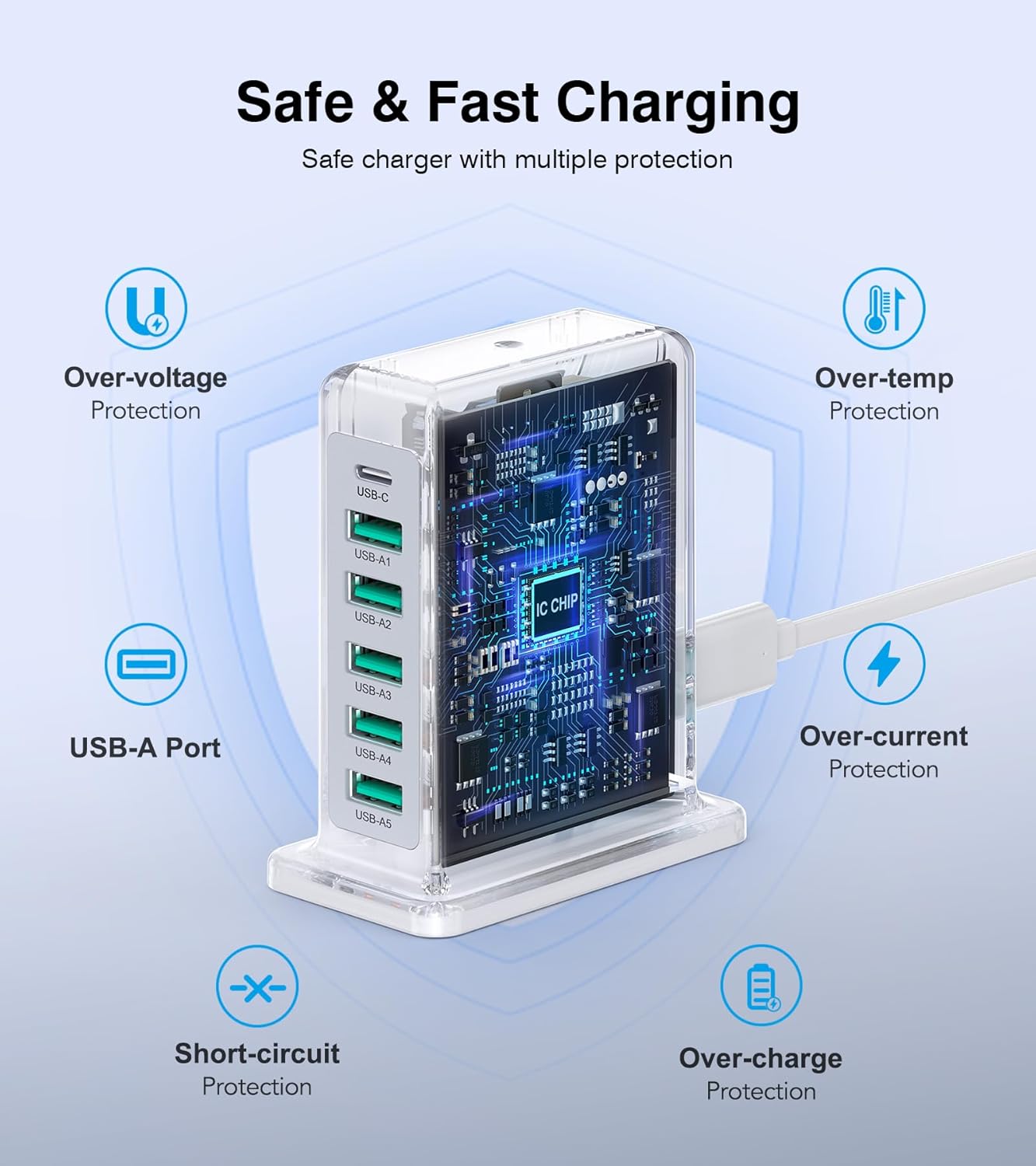 • Safety Charging: Built-in multi-layer safety system with upgraded heat dissipation. Avoid short circuit, overcurrent, overvoltage, overheating, and overcharging. Fireproof PC material and UL certification ensure 100% comprehensive protection for you and your devices