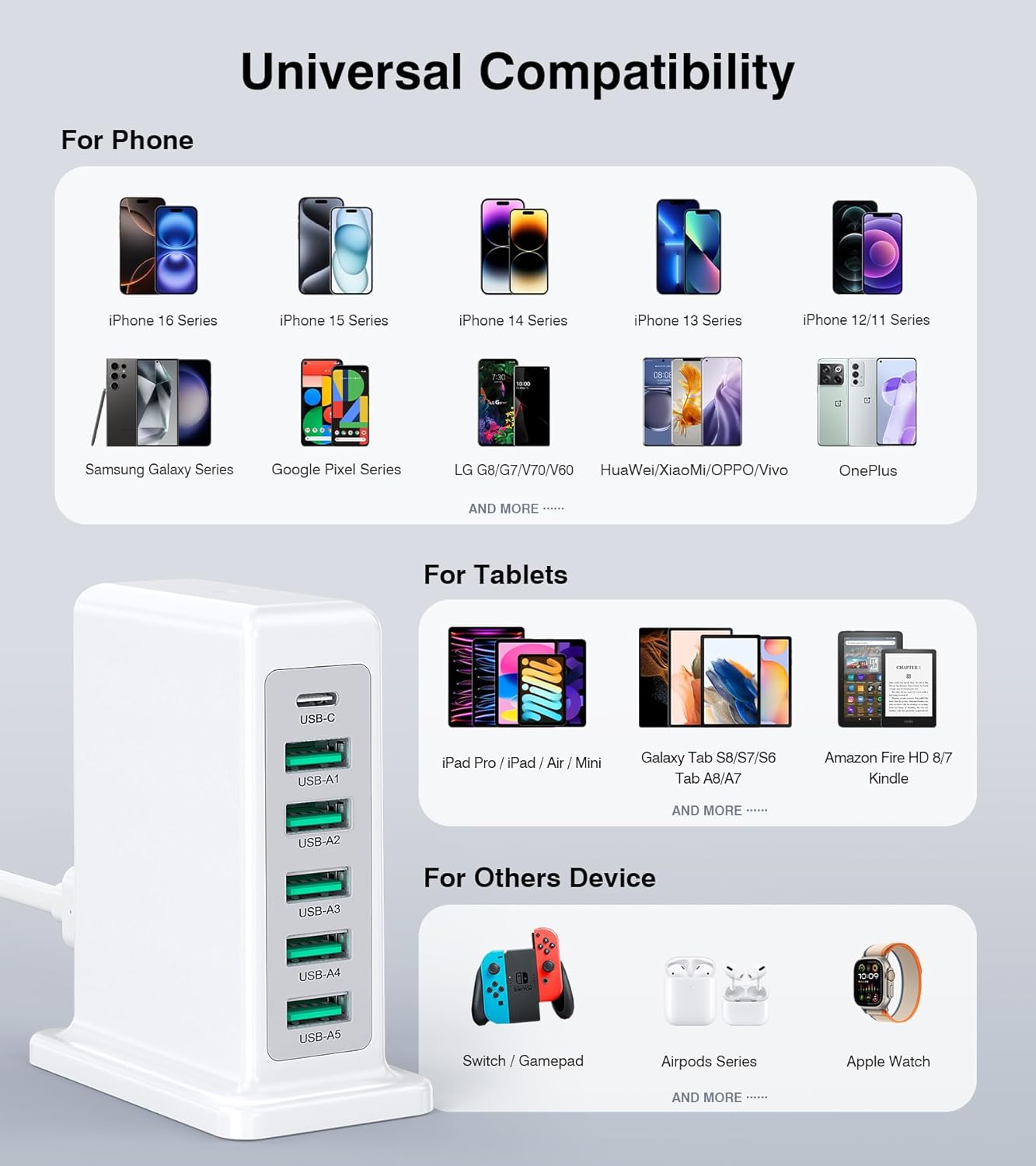 • USB Charging Station: 6 Port USB charging tower can charge multiple devices at the same time, solving the problem of insufficient chargers. USB C and USB A ports have a maximum output of 15W, and the usb charger charges your phone quickly